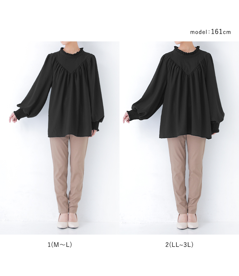 | 「標準さん」 157cm/51kg B85 W69 H89 普段はM またはLサイズ着用。 | 【1(M〜L)】 ◆着丈:ヒップが丁度隠れる位 ◆袖丈:手の甲が隠れる位 【2(LL〜3L)】 ◆着丈:ヒップ下位 ◆袖丈:指先まで隠れる位 1(M〜L)は全体的に程よいゆとりがありスッキリと着られました。2(LL〜3L)は身幅が広く、ゆったりした着用感でした。 |