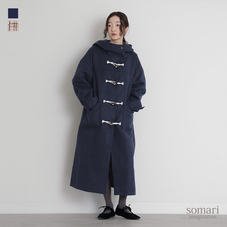 ■デザイン somariらしくデザイン性にもこだわったダッフルコート。かっちりとしたイメージのダッフルコートですが、ドロップショルダーにすることでゆるっと羽織れてこなれ見えするシルエットに。フードボタンはポイントになるようほんのりアシンメトリーにデザインし、大きめのスタンドフードで小顔効果も期待できます。後ろ裾はベンツ開きにしてロング丈でも快適な足さばきを叶える仕様です。ベーシックで合わせるアイテムを選ばない無地デザインと、秋冬コーデのアクセントになるチェック柄デザインでご用意いたしました。チェック柄デザインはパッチポケットと袖タブ部分をバイアス仕様にして、アクセントにしました。 ■コーディネート デイリースタイルからよそゆきスタイルまで、合わせるアイテム次第でカジュアルにもきれいめにも着回しのきく一着です。特に無地デザインはシンプルから柄ものまで、幅広いアイテムと好相性。チェック柄デザインはシンプルなコーディネートの上にさっと羽織るだけで、シーズンムード高まる華やかな着こなしに。 きちんと感もあるダッフルコートはキャップやニット帽、スニーカーなどでさらにカジュアルダウンさせた遊び心のあるコーデもおすすめです。 ■素材 無地にはしっかりと厚みのあるメルトン生地を、チェック柄には柔らかく程良い厚みの生地を使用。どちらも毛足感があり、暖かみのある印象を与える生地感です。裏地にはさらりとした肌触りのタフタ生地を使用し、袖通しも快適な一枚。 |