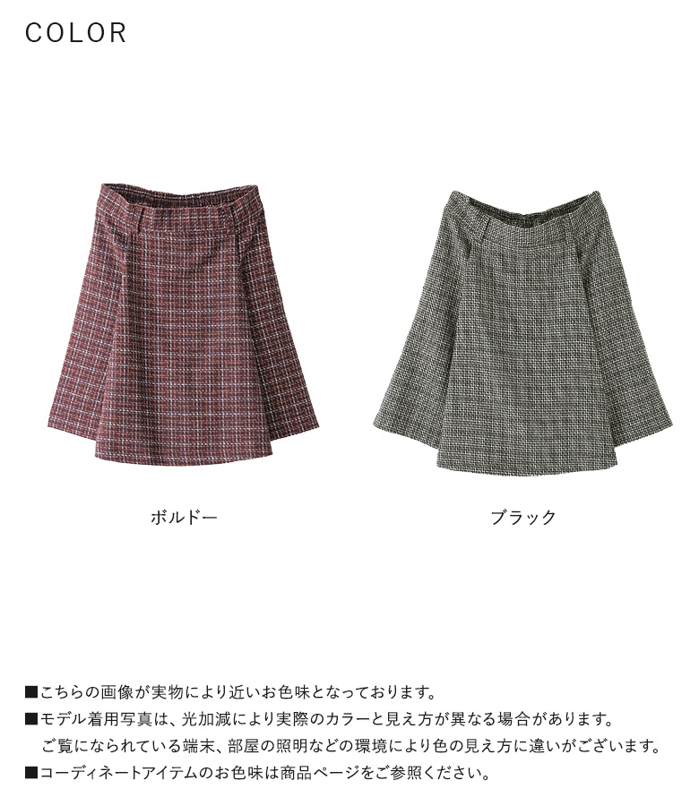 | 『まるで、スカート。』 今、大人が穿きたいスカート見えハーフパンツ♪ ハーフパンツのフロントに、タックスカート見えするパーツがついていて、めくれずに穿ける優秀item。シンプルな台形シルエットで着回しやすく、短すぎない大人な丈感がセンスを格上げします。 様々な色の糸を織り合わせたツイード生地で、滑りの良い裏地付き。 M〜3Lサイズ展開だから、好きなシルエットを選べるのも嬉しいポイントです。 今、好きな物、興味あることを自由な発想で表現できる≪ n'OrLABEL ≫。 「実用性と機能性、そして遊び感覚」、多面性を楽しめるピュアでモードなデザインライン。 季節を彩るお洒落を楽しむ≪n'OrLABEL≫スカート風ツイードハーフパンツです。 |