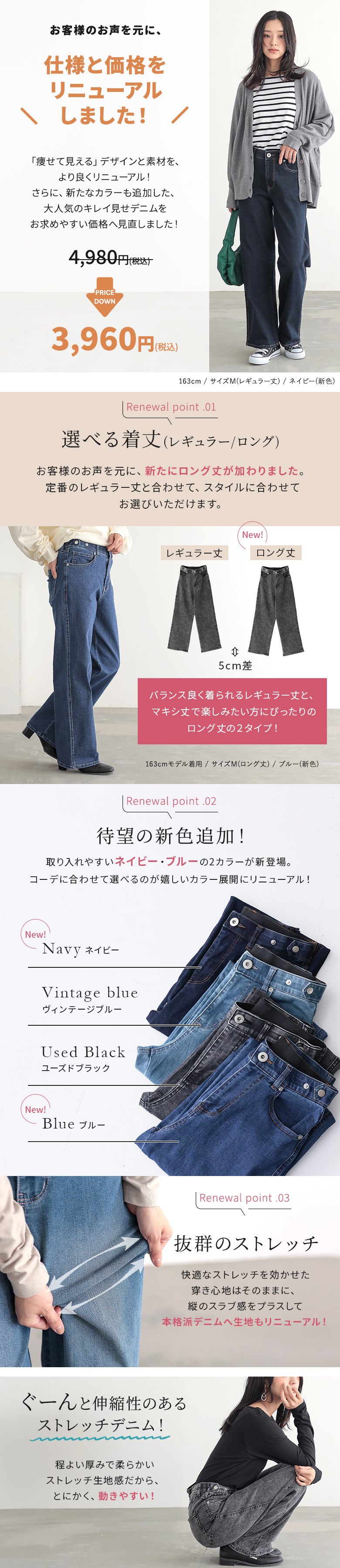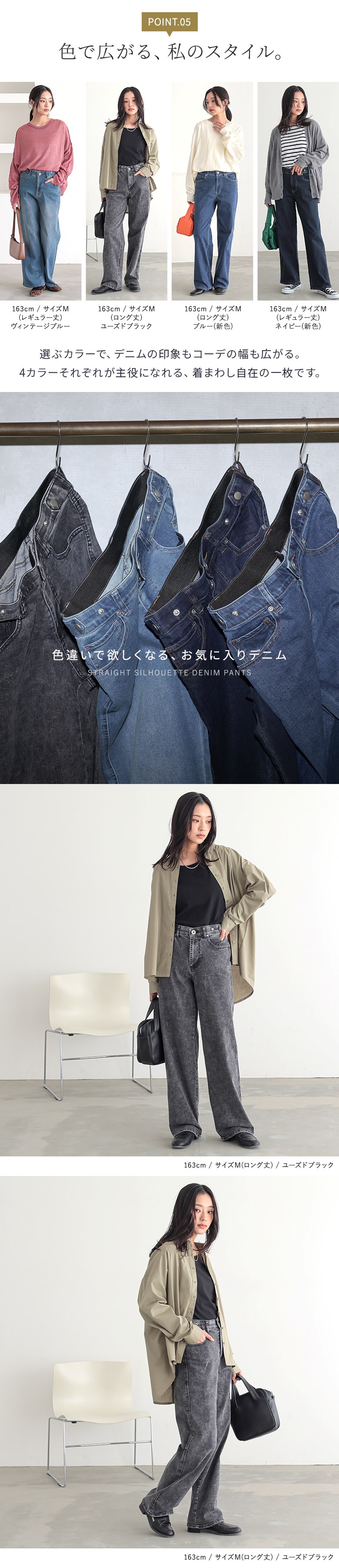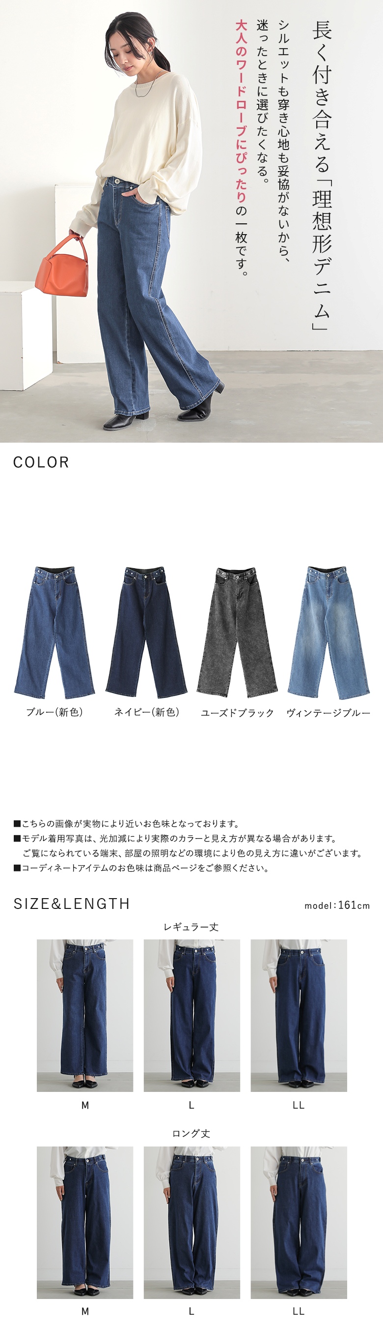 | 素材 | コットン66% ポリエステル19% レーヨン13% ポリウレタン2% ヴィンテージブルー・ブルー・ネイビー:コットン69% ポリエステル27% レーヨン3% ポリウレタン1% ユーズドブラック:コットン61% ポリエステル28% レーヨン10% ポリウレタン1% ※生産時期により混率が異なります。ご了承の上、お買い求めください。 |