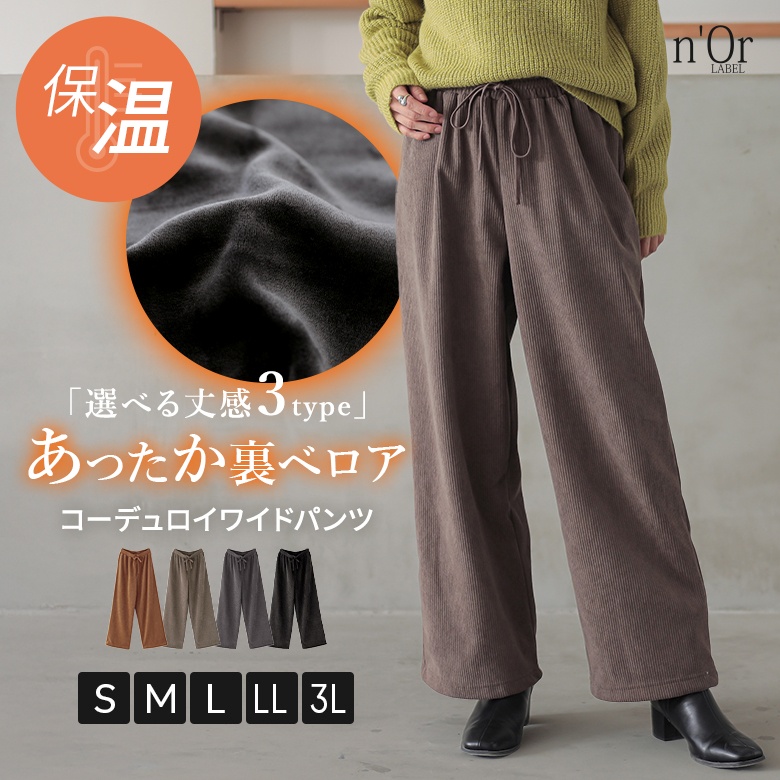 | 脚のラインを拾わないこだわりのストレートワイドシルエット。 表側は滑らかなコーデュロイ生地×裏側はふんわり優しい肌触りのベロア生地を使用し、やみつきになる穿き心地を実現します。 |