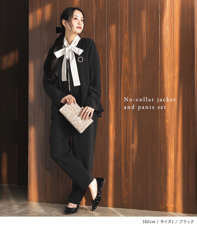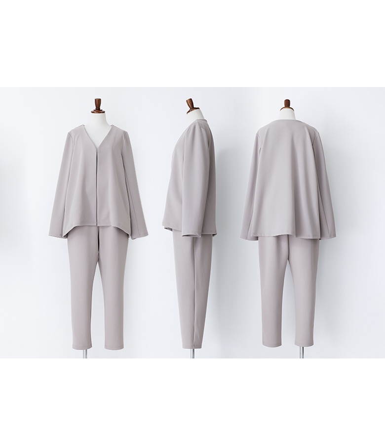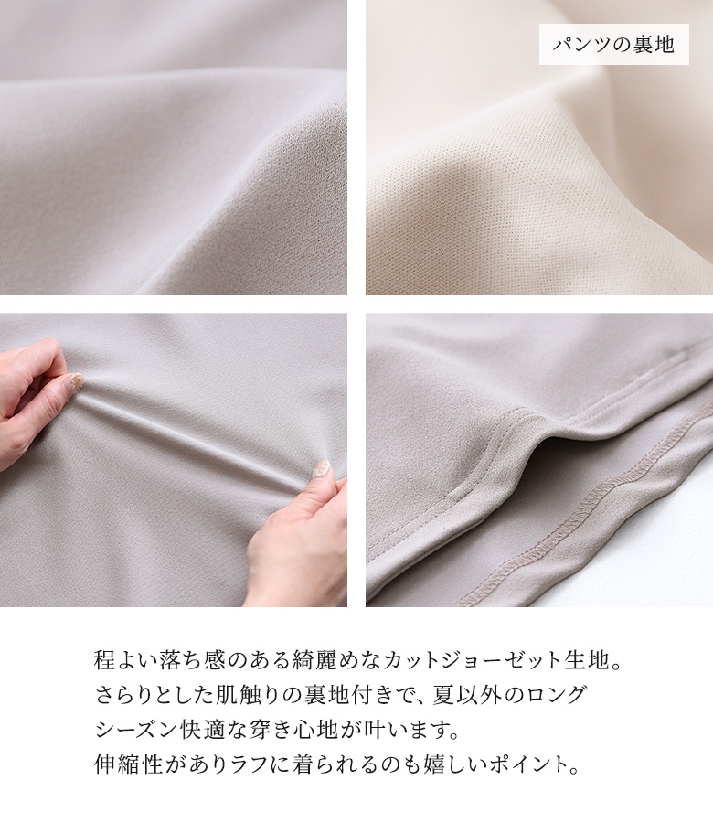 ■デザイン 様々なインナーと合わせやすいノーカラージャケット×すっきりとしたテーパードパンツのセットアップ。ジャケットはフレアシルエット、パンツは腰回りゆったりで体型カバーを実現。 ■素材 程よい落ち感のあるきれいめ印象のカットジョーゼット生地を使用。伸縮性に優れた着心地の良い生地感が特徴です。 |