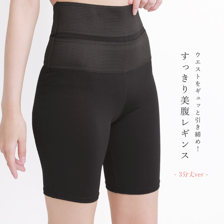 | 『ぽっこりお腹もギュッと引き締め。』 周りの目を気にせず、スタイルアップが狙えるサポートレギンス。 太ゴムバンドとパワーネットの2つのサポートで、お腹からウエストまでの広範囲をスッキリ引き締めて、腰回りまでぐるっとしっかりサポート。 伸縮性の高い生地を採用し、補正下着特有の過剰な締め付け感を軽減。体の気になる部分を引き締めながら、着心地も快適なレギンスです。 穿くだけで簡単にボディメイクできる、美レギすっきり美腹3分丈レギンスです。 |