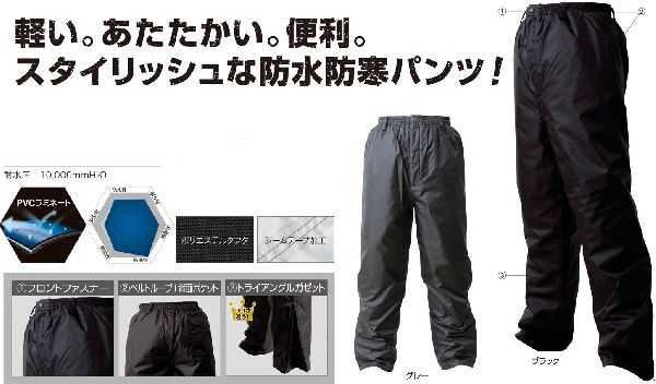 | 【素材】表:ポリエステル100%(PVCコーティング)(耐水圧10000mm)/中綿:ポリエステル100%/裏地:ポリエステル100% 【色】グレー ブラック 【サイズ】M L LL EL 4L |