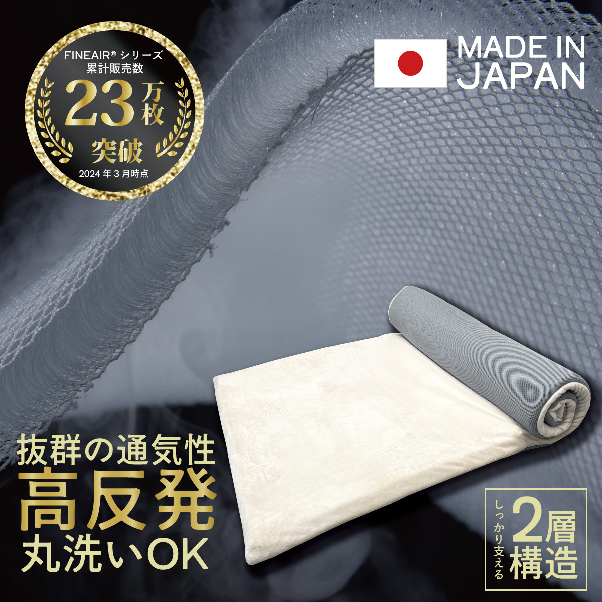 快適な眠りのために開発された「オーシン高反発ファインエアーマットレス2層構造」ファインエアーシリーズ累計23万枚を突破する実績を誇ります。