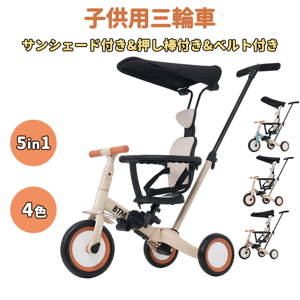 【新春祭★ボナースストア+5%】三輪車 5in1 子供用 子供乗せ自転車 5in1 キックバイク 押し棒付き 1歳 2歳 3歳 サンシェード付き 安全バー付き BTM 子供