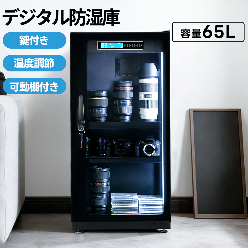 防湿庫 ドライボックス 65L デジタル防湿庫 自動除湿 カビ対策 静音 鍵付き 可動棚 LED照明内蔵 タッチボタン 省エネ カメラやレンズ収納ケース 防湿ケース