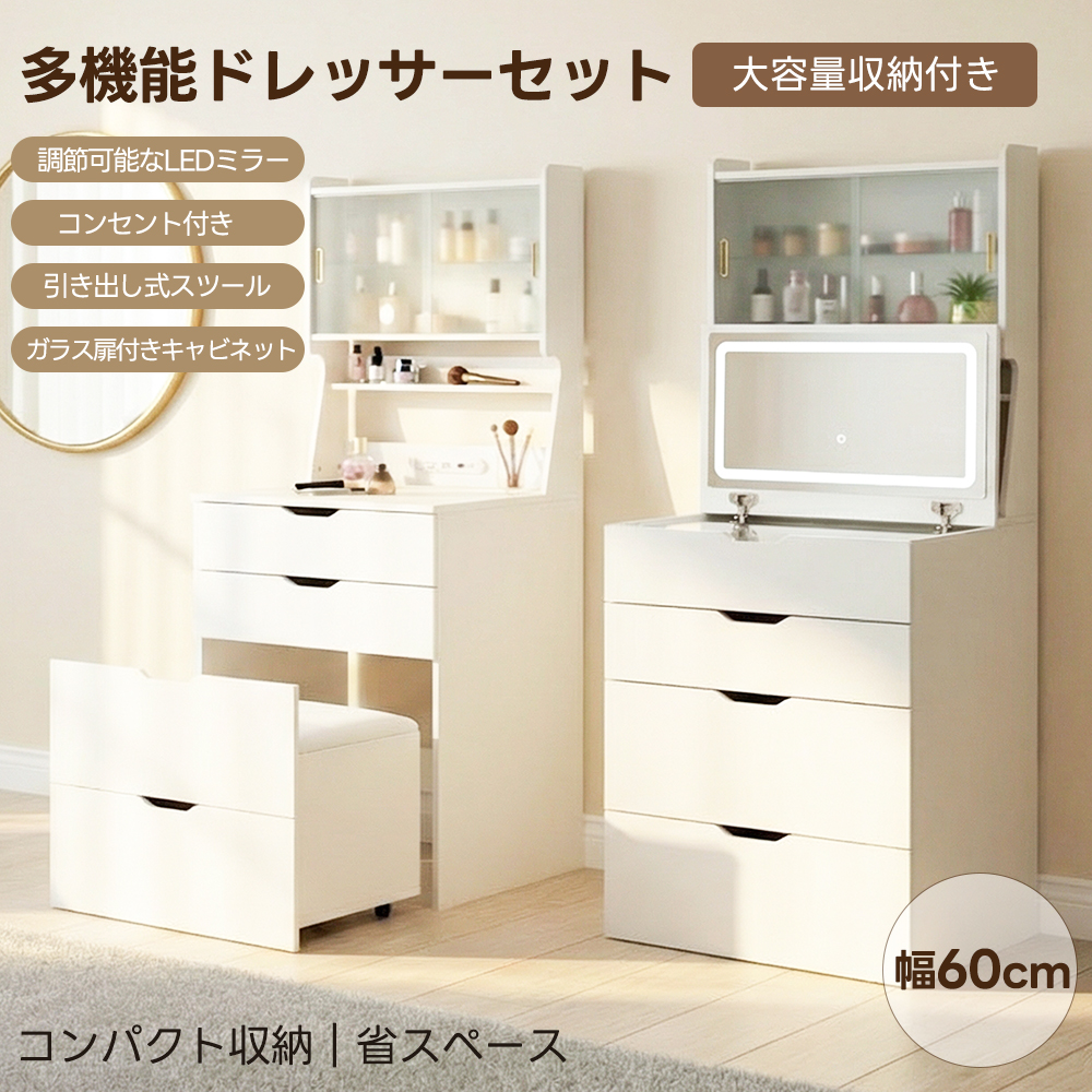 【全ストア5%OFFクーポン利用】ドレッサー 椅子一体型収納付き LEDライト付き 3色LED コンセント付き 化粧台 テーブル 収納力抜群 鏡台 女優ミラー 引き