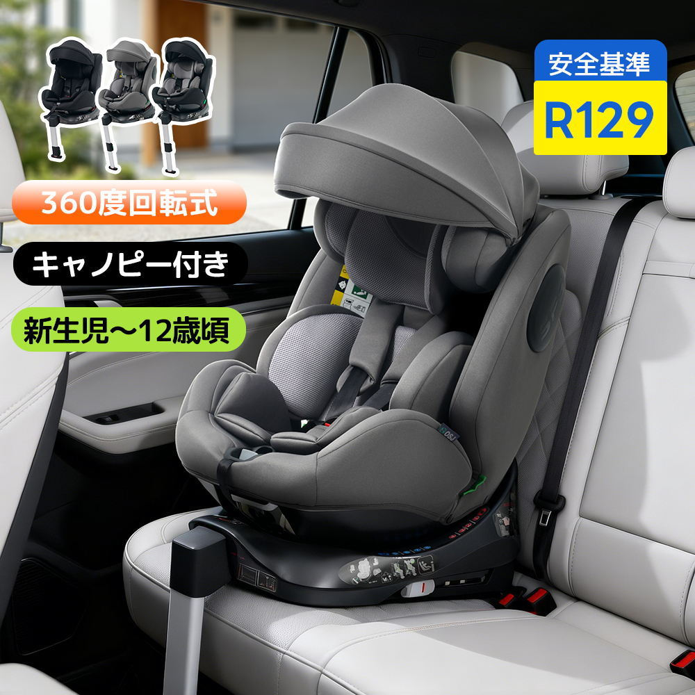 チャイルドシート 新生児 ISOFIX R129適合 0歳〜12歳頃 360度回転式 ジュニアシート キャノピー付き サポートレッグ固定 長く使える 洗える 取付簡単