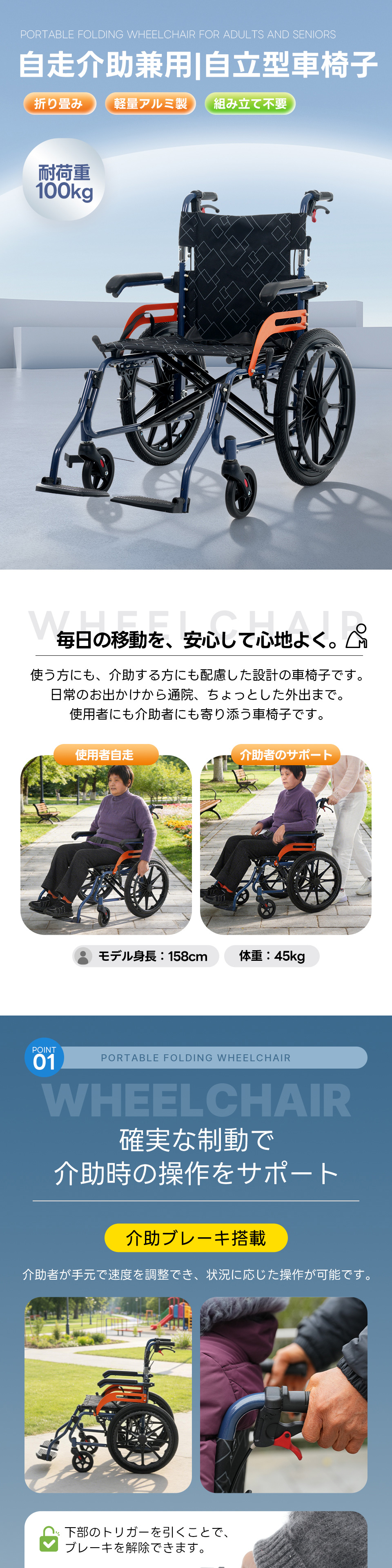 車椅子 軽量 アルミ製 自走介助兼用 コンパクト 折りたたみ 軽量車椅子 自立 ノーパンクタイヤ 介助ブレーキ付き 駐車ブレーキ 座面付き 介護用 耐荷重100kg