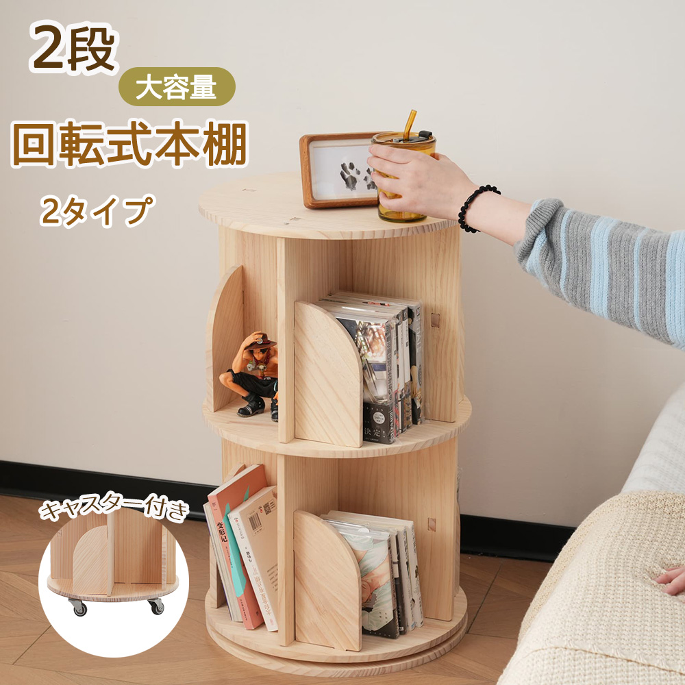 回転式本棚 二段 絵本棚 木製 2段 子供 A4対応 ブックシェルフ 飾り棚 回転本棚 天然松木 スリム 絵本 漫画 DVDラック 回転ラック フィギュア ディスプレイ