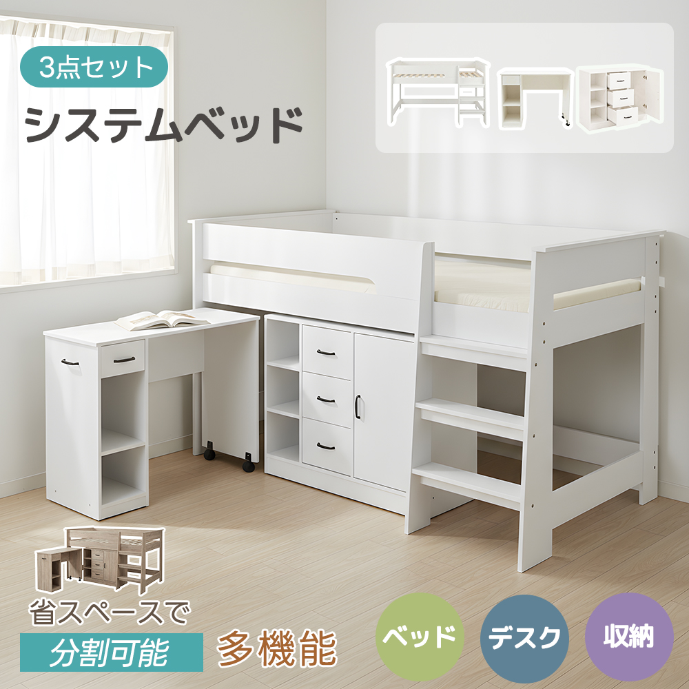 【爆買WEEK+5%★全品クーポン配布中】システムベッド ロフトベッド デスク付き 3点セット 子供用 大人用 ロータイプ ミドル高さ シングル ベッド 学習机