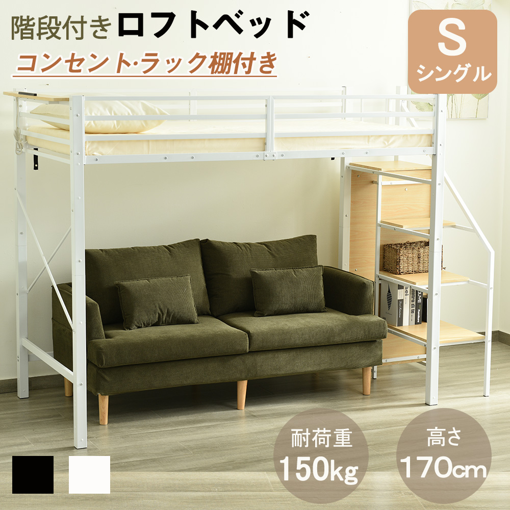 ロフトベッド 階段付き パインベッド シングル コンセント付き 収納付き ラック棚付き システムベット 子供部屋 子供ベッド 頑丈 耐震 一人暮らし