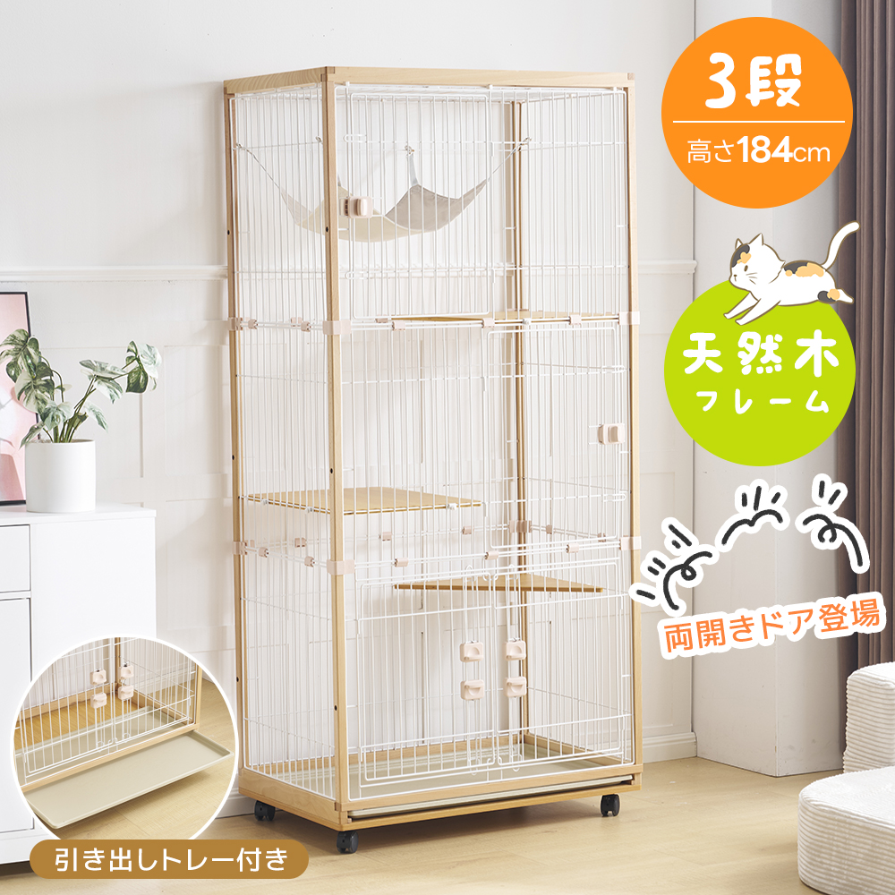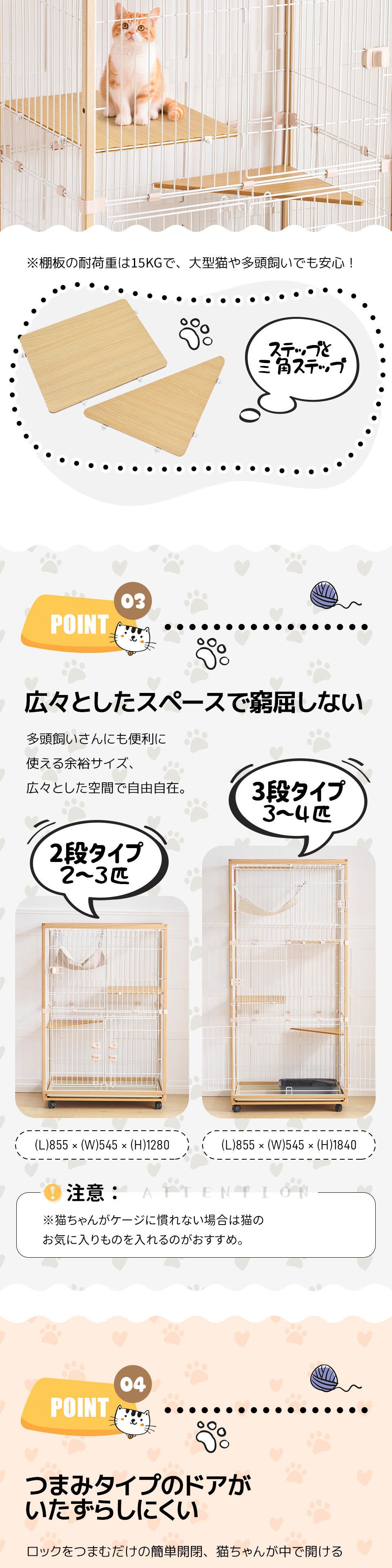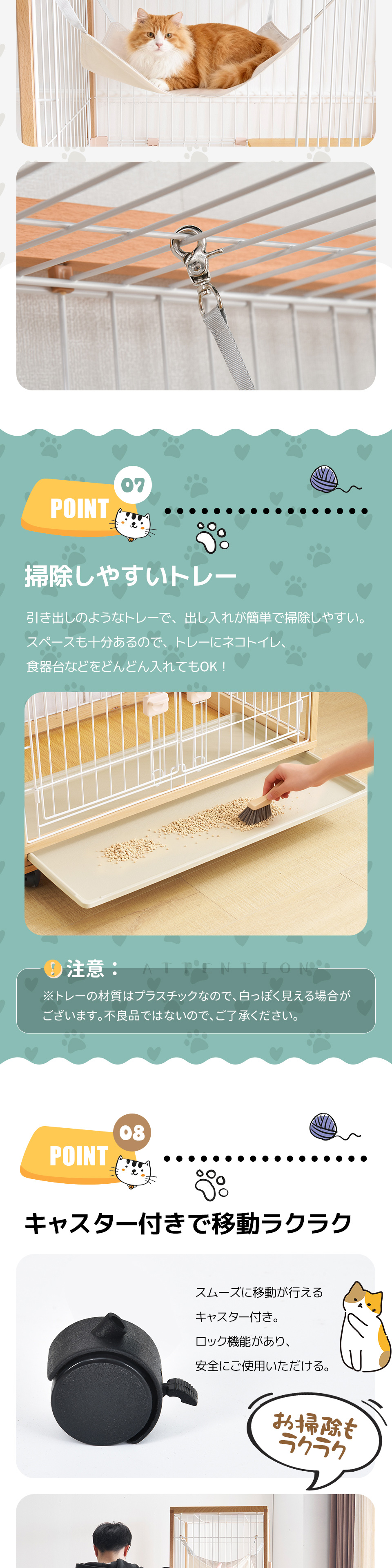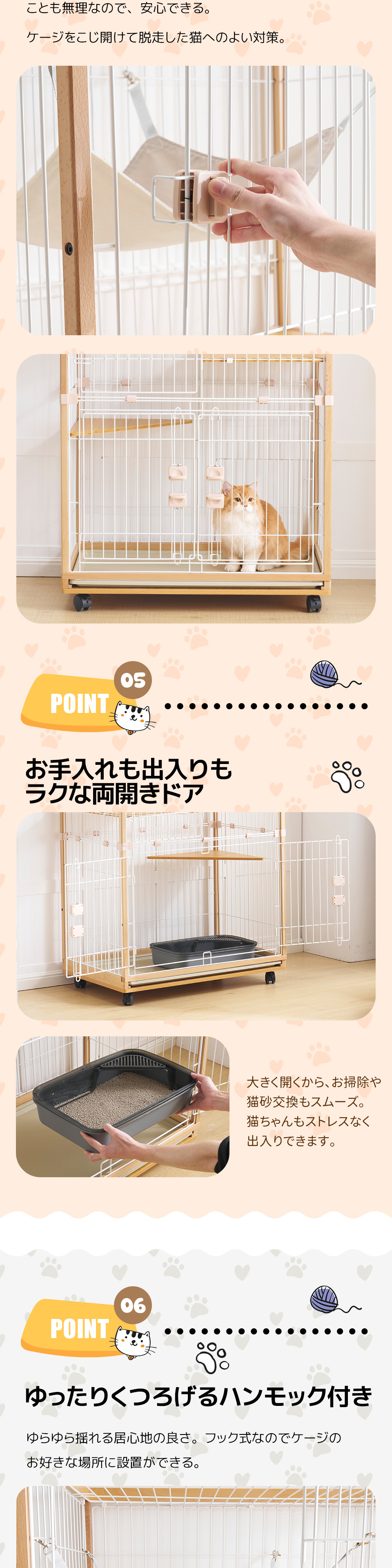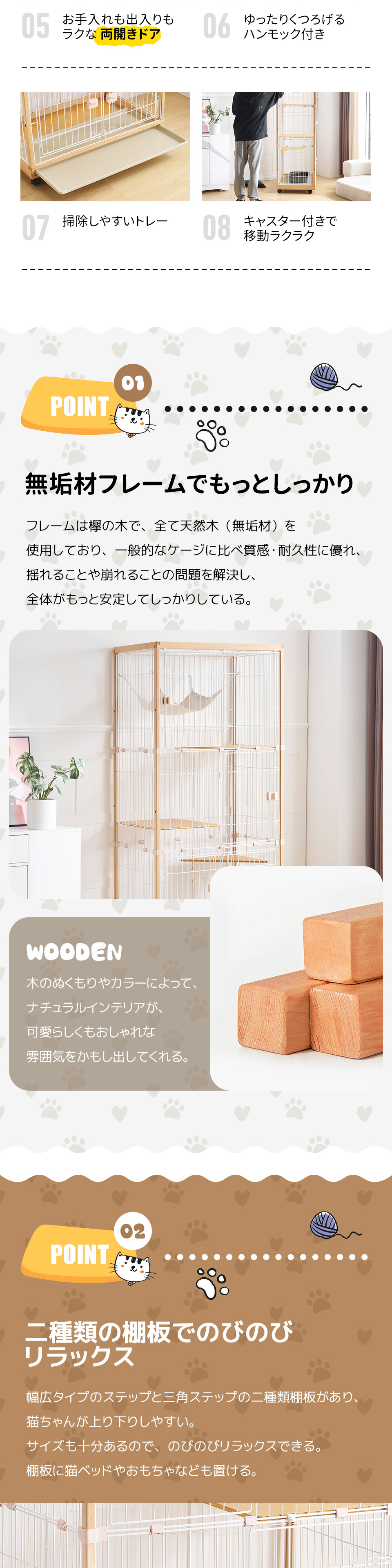 4 猫が病気になる時世話しやすい構造。他の子とも距離を保つ 5 お料理中やお食事中いたずら防止やテーブルに上がるのを防止する。 ◆02猫ちゃんの安全を守って、飼い主も安心!1無垢材フレームでもっとしっかり2二種類の棚板でのびのびリラックス3広々としたスペースで窮屈しない4つまみタイプのドアがいたずらしにくい5猫ドア付きて出入り自由6ゆったりくつろげるハンモック付き7掃除しやすいトレイ8キャスター付きで移動ラクラク