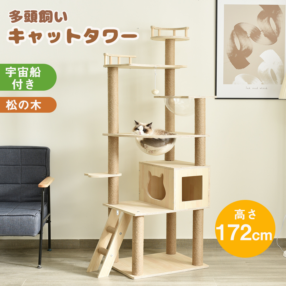 【新春祭!最大5%OFFクーポン利用可能】キャットタワー 据え置き 階段付き 宇宙船付き 多頭飼い 天然木 ハンモック付き 段階 高さ172cm 子猫 大型猫 猫タ