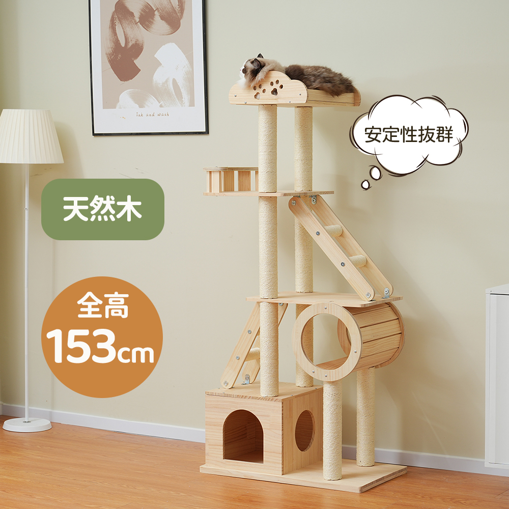 キャットタワー 木製 天然木 高さ153cm頑丈 据え置き 隠れ家 上り下りしやすい キャットタワー 爪とぎ 猫ベッド 安全安心 ペット用品 木製 季節を問わず 展望台 おしゃれ