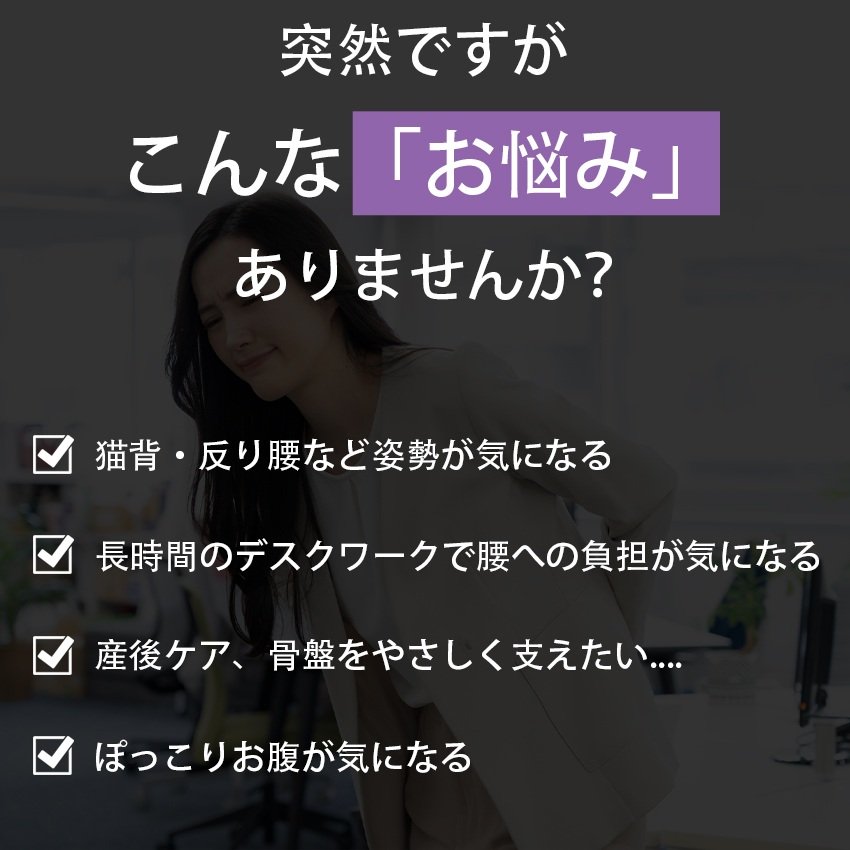長時間の座り仕事や車の運転、老化や肥満、腰痛によって腰に不安をお持ちの方の、腰の動きをしっかりサポート。ヘルパー、介護職、出産後の女性にもお勧めします