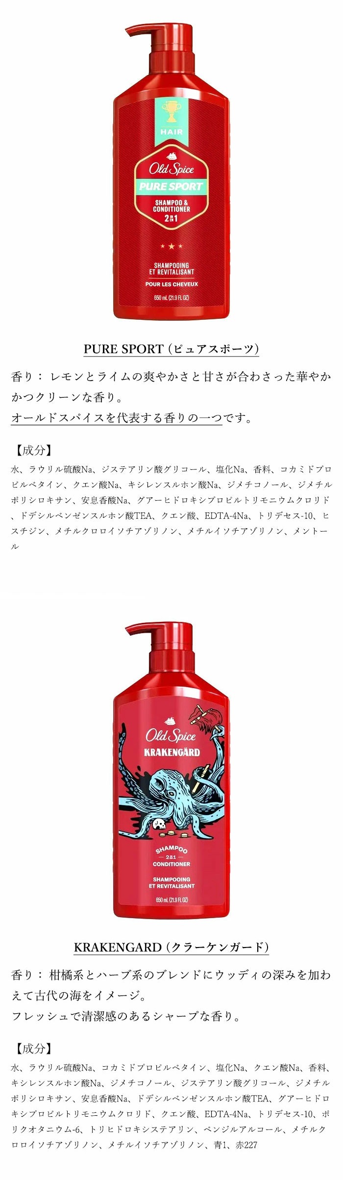 アメリカのデオドラントの代名詞的存在である「OLD SPICE (オールドスパイス)」からリリースされているシャンプー & コンディショナー。 オールドスパイスがバーバーにインスパイアを受け、こだわり抜いたサロン品質をご自宅でも体験していただけるよう、開発されたシャンプー & コンディショナーになります。 オールドスパイスらしい、まるで香水でヘアケアをしているようなラグジュアリーな使い心地。 洗う時も、その後も "いい香り" が続く、これ1本でシャンプーとコンディショナー、2つの役割を担ってくれます。 【注意点】 TIGERCLAW にはコンディショナーの成分は含まれておりません。 2in1ではなく、シャンプー単体の製品となっております。 【内容量】 650ml (21.9oz) 【香り】 ※香りによってそれぞれ特徴・仕様も異なります。 【注意点】 繊細で上品な控えめな香りが多い日本製とは違った、アメリカならではの香り、また、強い香りが苦手な方にはおすすめできません。 ・PURE SPORT (ピュアスポーツ) 香り: レモンとライムの爽やかさと甘さが合わさった華やかかつクリーンな香り。 オールドスパイスを代表する香りの一つです。 ・KRAKENGARD (クラーケンガード) 香り: 柑橘系とハーブ系のブレンドにウッディの深みを加わえて古代の海をイメージ。 フレッシュで清潔感のあるシャープな香り。 ・BEARGLOVE (ベアグローブ) 香り: りんごと柑橘類の清涼感のある爽やかな香り。 香りを引き立たせるためにほんの少しピリッとしたスパイスをプラス。 ・MAMBAKING (マンバキング) 香り: アンバー、ベリー、プラムの甘酸っぱい香り。 ・FIJI (フィジー) New 香り: ココナッツと浜辺をイメージさせる香りです。 女性にも人気が高く、オールドスパイスの香りのラインナップの中で、常に売り上げ上位! 【使用方法】 髪や頭皮を十分にすすいだ後、適量を手のひらに取って (軽く泡立てて) 、髪全体につけ、よく泡立てて洗い、最後はシャンプー剤が残らないよう丁寧に洗い流して下さい。 【おすすめの洗髪方法 (ご参考までに)】 シャンプー剤をつける前にお湯で予洗い、十分に汚れを落としてから (時間にして最低1分以上) シャンプー剤を手のひらで軽く泡立て (モコモコにしなくて大丈夫です) 、シャンプー剤を指の腹で頭皮全体にまんべんなくなじませます。 指を開きながら全体になじませていると空気を含むことができ、その結果この段階でモコモコ泡になります。 このモコモコ泡を使って一気に洗い上げます。 その後、十分に時間をかけ (時間にして最低3分以上) しっかりと洗い流します。 【ポイント】 「湯シャン」という言葉がありますが、髪の汚れはお湯だけで約7〜9割落ちると言われています。 とにかくシャンプー前に十分にシャワーで流すことが重要です。 また、シャンプー前の予洗いが不十分な場合、泡立ちが悪くなります。 特に夏場や運動後は通常より頭皮に皮脂が残っており、泡立ちの悪さにつながります。 泡立ちが不十分だと洗浄成分が発揮されず、汚れが落ちきらず、匂いやベタつきの原因となり衛生的にもよくありませんので、最低でも1分以上を目安にしっかりと予洗いを行ってください。 【成分】 商品画像にそれぞれ記載 ※オールドスパイスの製品はすべて動物実験は行っていません。 【使用上の注意事項】 ・頭皮に傷、湿疹等異常のある時は使用しないで下さい。 ・刺激等の異常が出たら使用を中止し、皮フ科医へ相談して下さい。 ・使用中は目に入らないよう注意し、入った時は、すぐに充分洗い流して下さい。 ・子供や認知症の方などの誤飲等を防ぐため、置き場所に注意して下さい。 ・転倒、落下等による液漏れに注意して下さい。 【注意点 (ご購入前に必ずご確認ください)】 ・輸入品につき予告なくパッケージ変更する場合がございます。 ・輸送等の段階でパッケージ (ボトル) に傷や汚れなどの損傷が生じている場合がございますが、本体に全く問題はございません。 ・商品の容器の性質上、輸送中に起こり得る軽い衝撃などで液漏れが生じてしまう場合がございます。 以上の点によるご返品・交換は、誠に勝手ながら承る事ができませんので、その旨も重ねてご了承頂いた上、お買い求め下さい。 【原産国】 アメリカ P&G 社 【発売元、製造元、輸入元又は販売元】 K-フラッグ株式会社 ※K-フラッグは P&G USA 正規輸入代理店です。 (薬剤師も常駐) 広告文責:有限会社LINKAGE 電話:0554-56-9124 商品区分:化粧品 [シャンプー/ブランド:OLD SPICE(オールドスパイス) 「無料ギフトラッピングサービスについて」 |