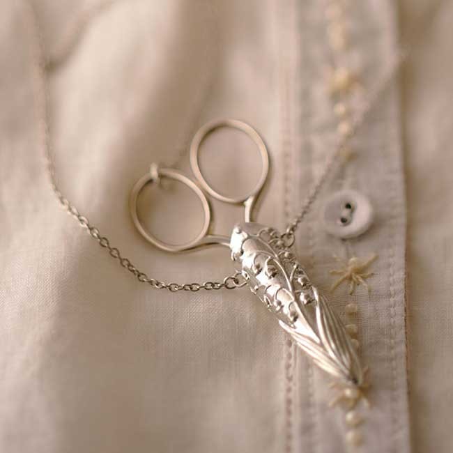こちらはネックレス式になっている「手芸はさみ」のご紹介です。デザインは人気雑貨アーティスト溝江里映による清楚なデザイン。そして製造は錫のユニークな商品で注目されている富山県の「能作」が製造(錫の部分)。そして手芸のトップメーカーのクロバーさんが最終の仕上げという3者のコラボレーションによって生まれた上質のお裁縫道具です。 純度100%の錫(スズ)製です。錫は金・銀の次ぐ高価な金属で、抗菌作用が強く金属アレルギーになりにくい素材のため、古くから食器や器に使用されていました。うっとりするほど素敵なお裁縫道具は自分へのご褒美にはもちろん、お裁縫好きの方への贈り物にもぴったりです。