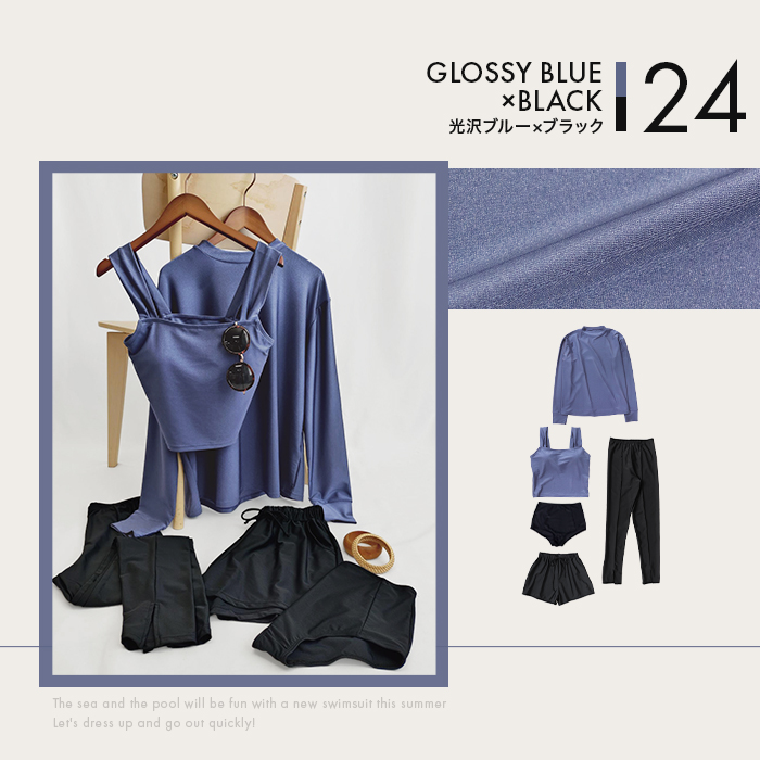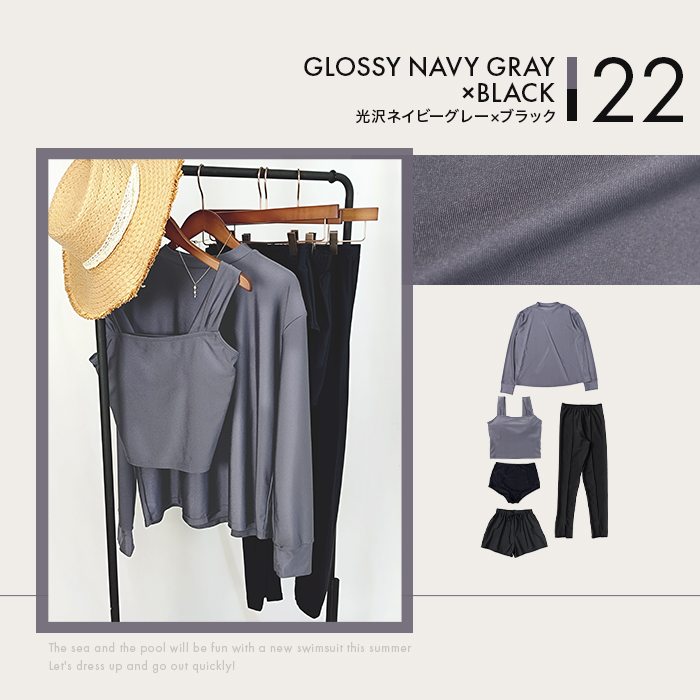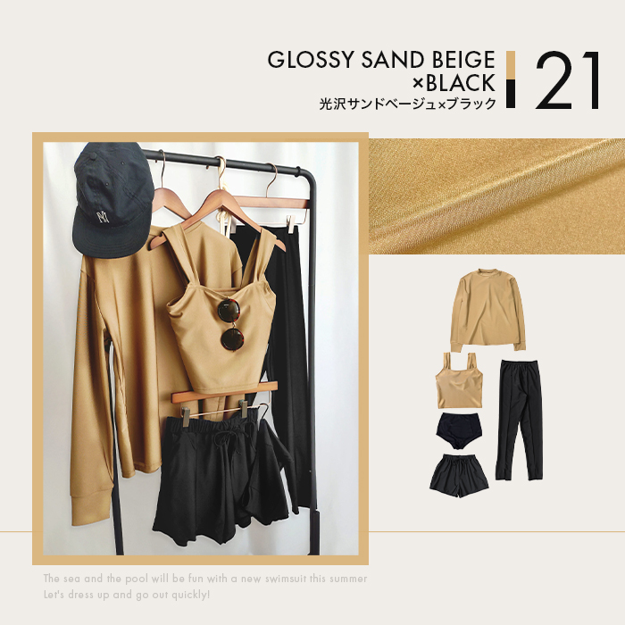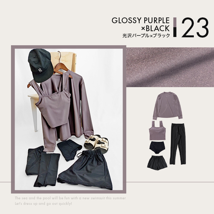 2026年新作カラーの光沢サンドベージュ/光沢ネイビーグレー/光沢パープル/光沢ブルーのラッシュガード&トップスは上品な光沢感が魅力。(その他カラーはマットな色味)