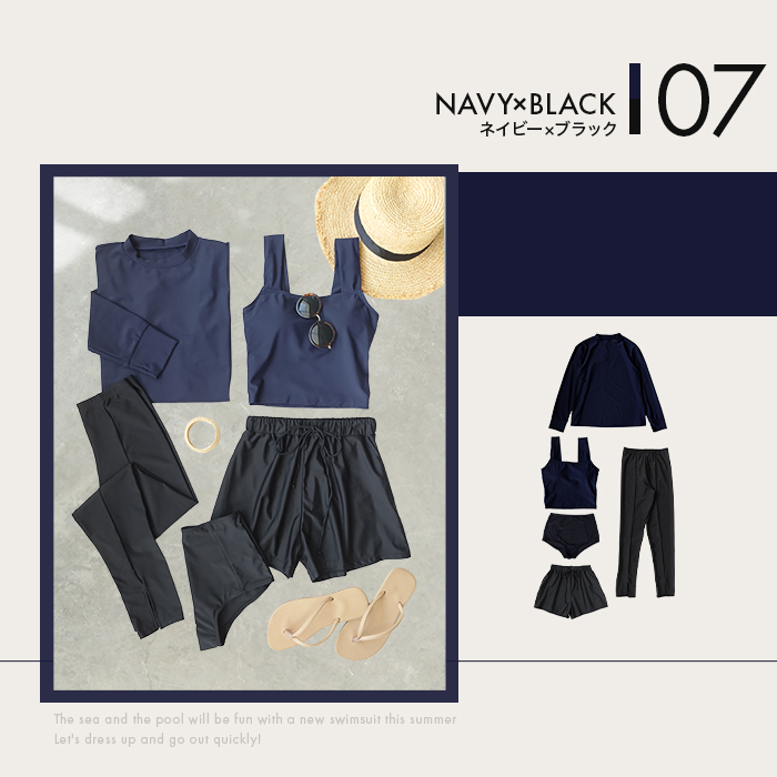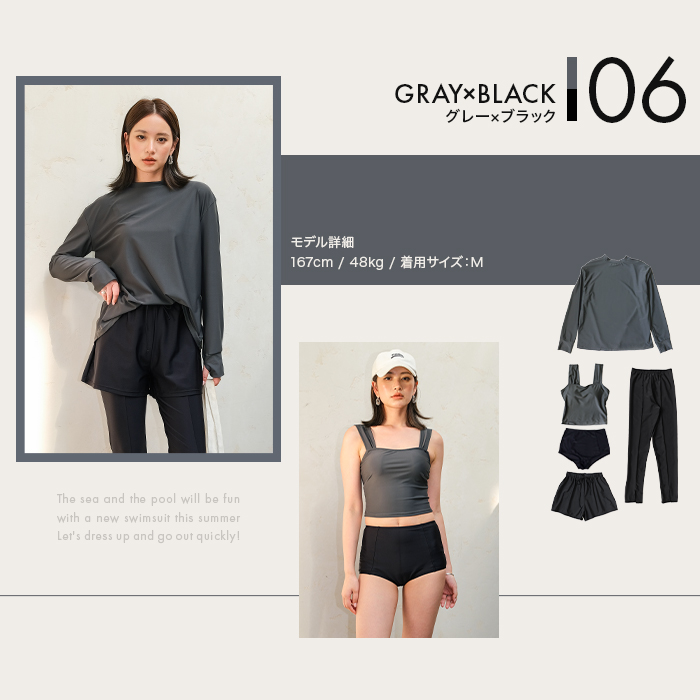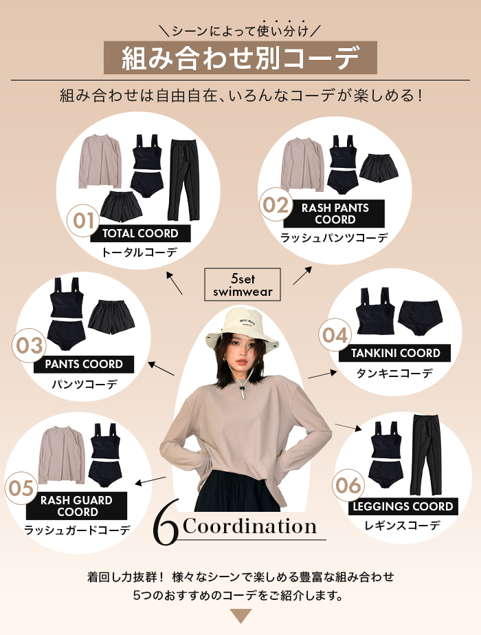 ラッシュガード、タンキニ、ショーツ、ショートパンツ、レギンスの5点セットです。