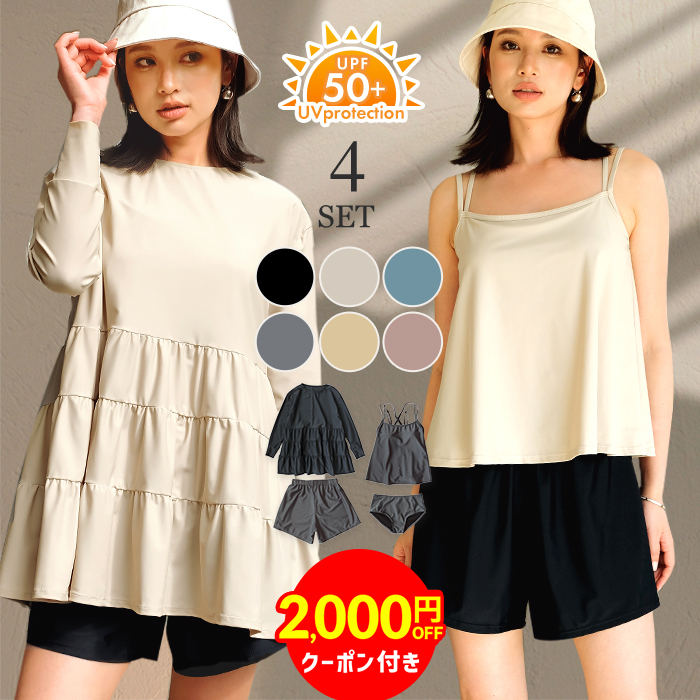 クーポン利用で5,980円 水着 レディース 体型カバー タンキニ ラッシュガード 4点セット UVカット UPF50+ ショートパンツ キャミ 20代 30代 40代 水陸両用