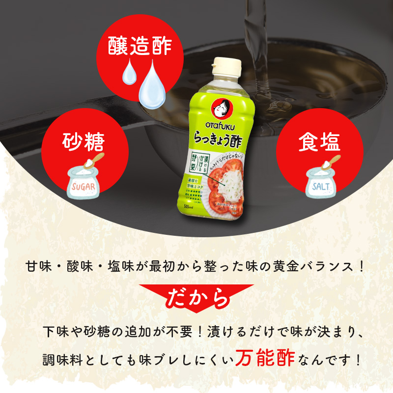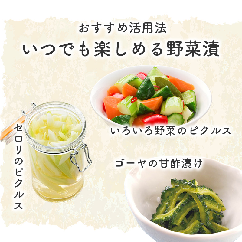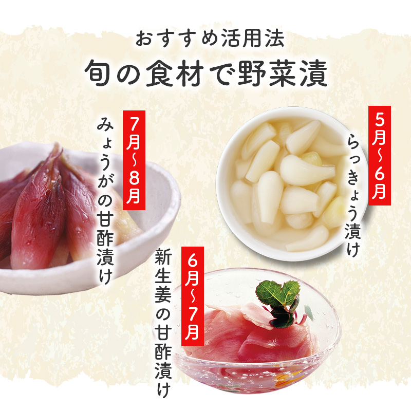 漬け込むだけでらっきょう漬が手軽にできます。他にも青梅、新しょうが、みょうが等幅広くお使いいただけます。