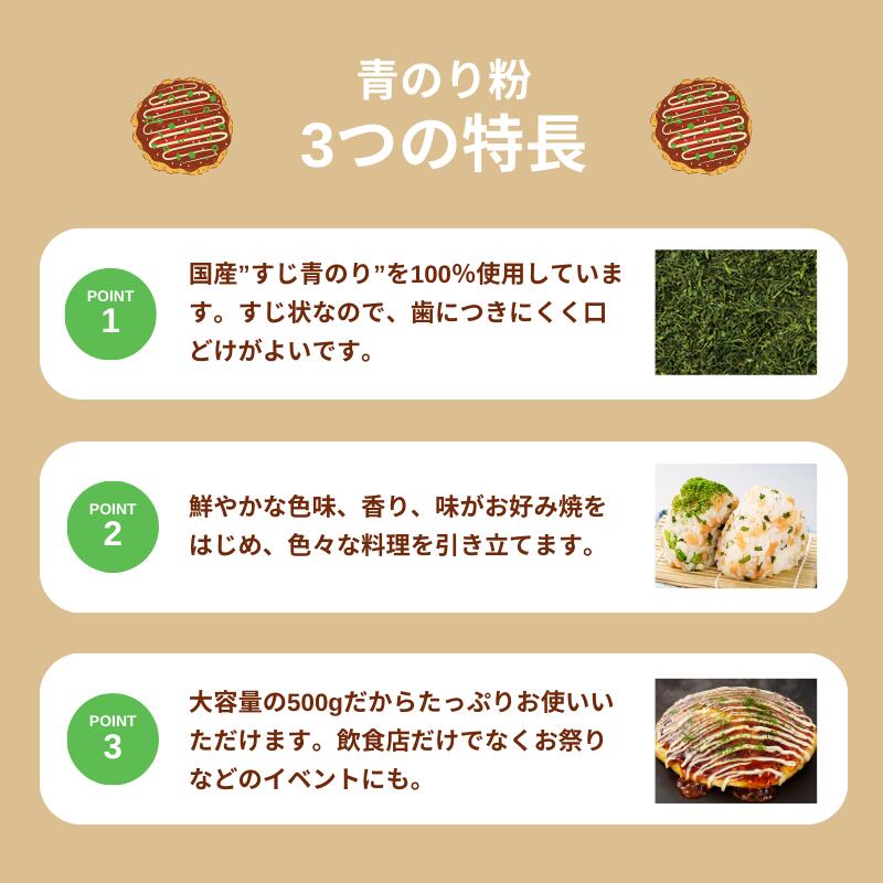 色、風味のよい、国産のすじ青のりを使用しています。すじ状なので、歯につきにくく口どけがよいです。自然の色、香り、味がお好み焼をはじめ、色々な料理を引き立てます。