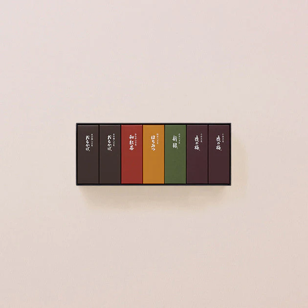 小形羊羹『夜の梅』『おもかげ』各2点、『新緑』『はちみつ』『和紅茶』各1点を詰め合わせました。