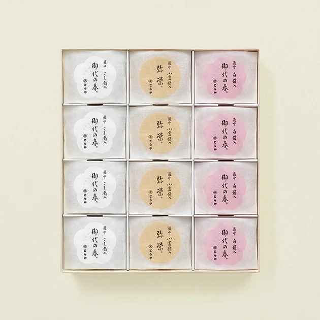 最中『御代の春 紅』『御代の春 白』『弥栄』各4点を詰め合わせました。