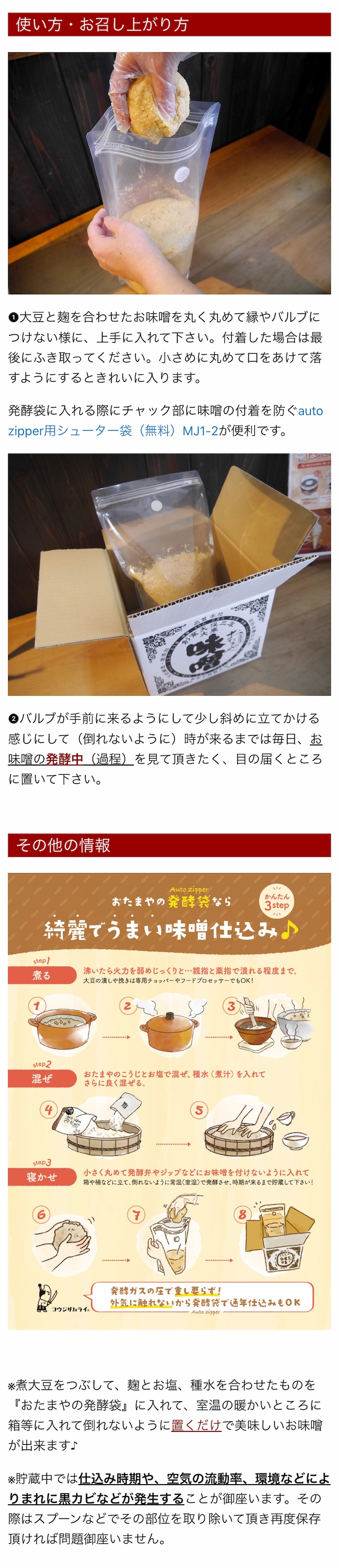 味噌の仕込みに便利!発酵ガス自動抜き弁付きのチャック付き袋 Mサイズ 2.5kg〜6.5kg程度の半製品お味噌を発酵熟成させる。仕込み量が丁度いい!このサイズはおたまやの一番人気でオリジナルのトリプルチャック(3重チャック)で繰り返し利用でき、さらに長持ち!バリアー性の高い厚手の発酵袋です。そして閉める際の感触が絶妙です。