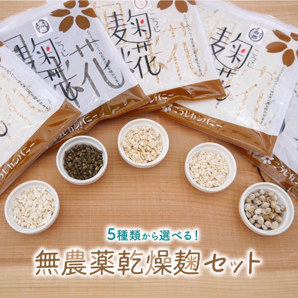 | 内容量 | 1.無農薬 乾燥米麹(120g) 2.無農薬 乾燥玄米麹(120g) 3.無農薬 乾燥黒麹(80g) 4.無農薬 乾燥白麹(100g) 5.無農薬 乾燥豆麹 (120g) ※5種類の無農薬乾燥麹の中からお好みの2種類 |