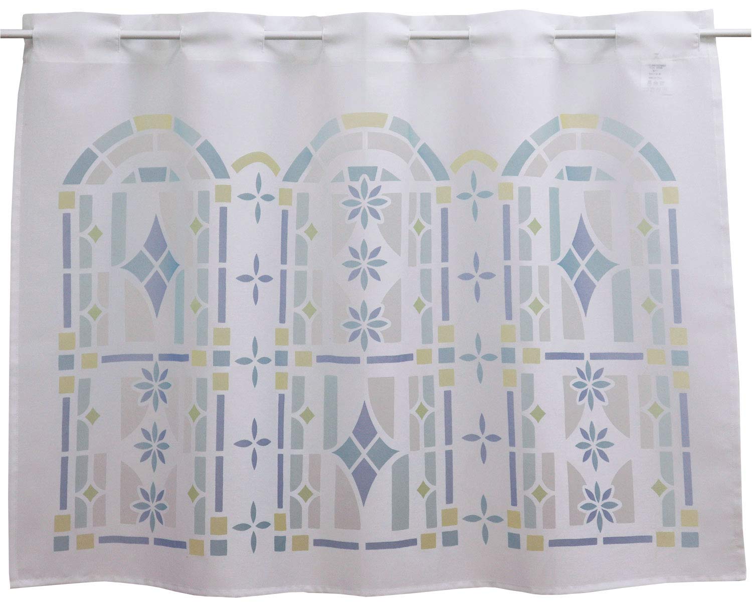 【デザイン】透明感のある爽やかな色づかいのステンドグラスをカフェカーテンで表現。窓からの光で柄がより引き立つオパール加工の美しいデザインです。お部屋の明るさによって窓辺の表情の変化も楽しめます。ちょっとした棚の目隠しにも。