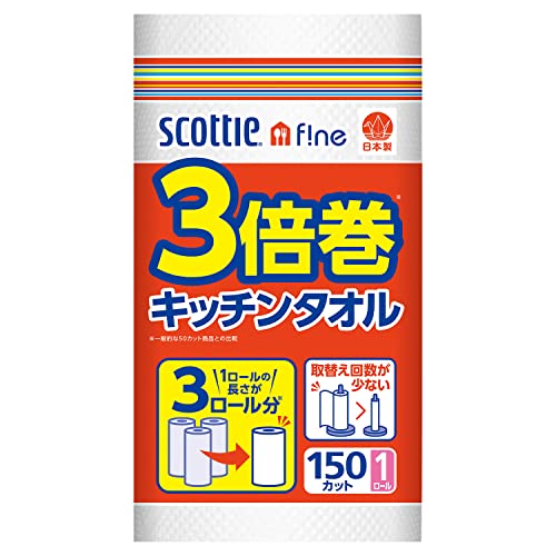 4Rで12Rの長さ 3倍長い! 150カットの超長巻! スコッティファイン 3倍巻きキッチンタオル 150カット 1ロール 24入