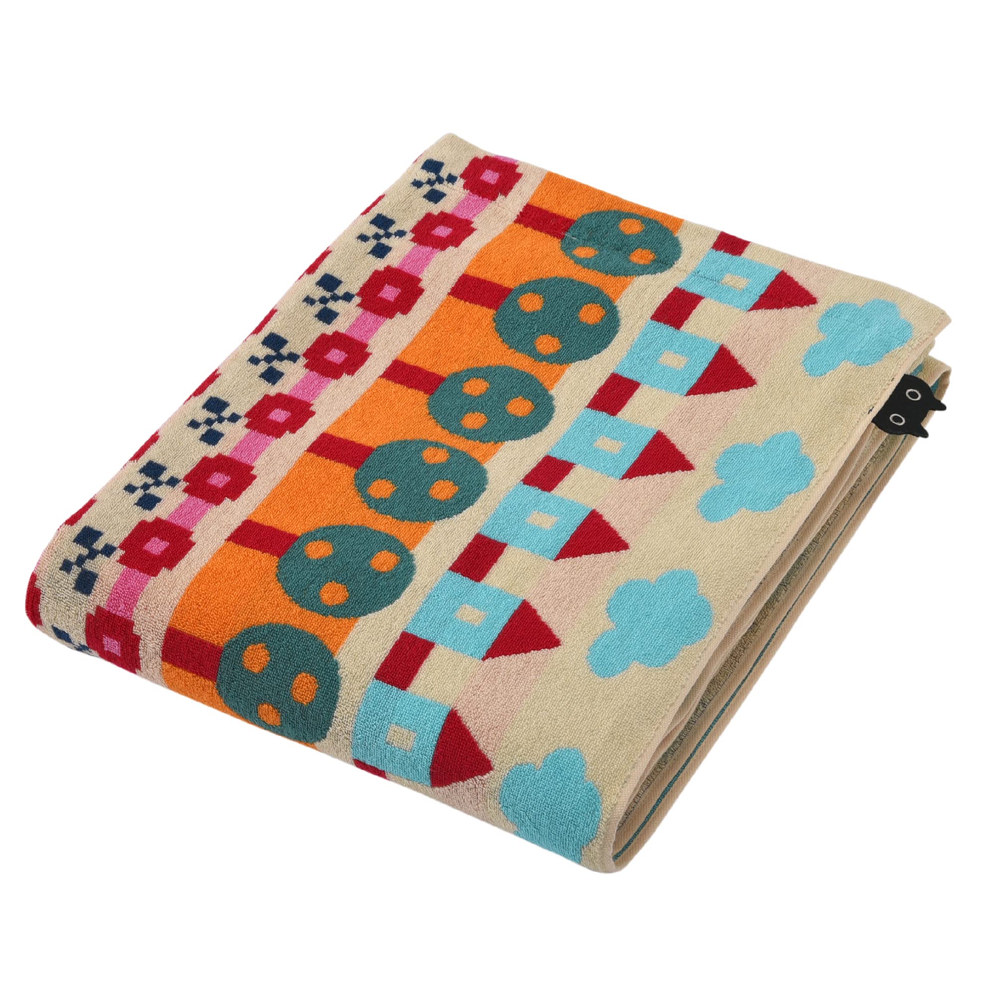 おうちと花壇をモチーフにした幾何柄がお部屋を可愛く彩ります。ひょっこり顔出しMEMEのアップリケがワンポイント。季節を問わずMEMEと一緒にお過ごしください。