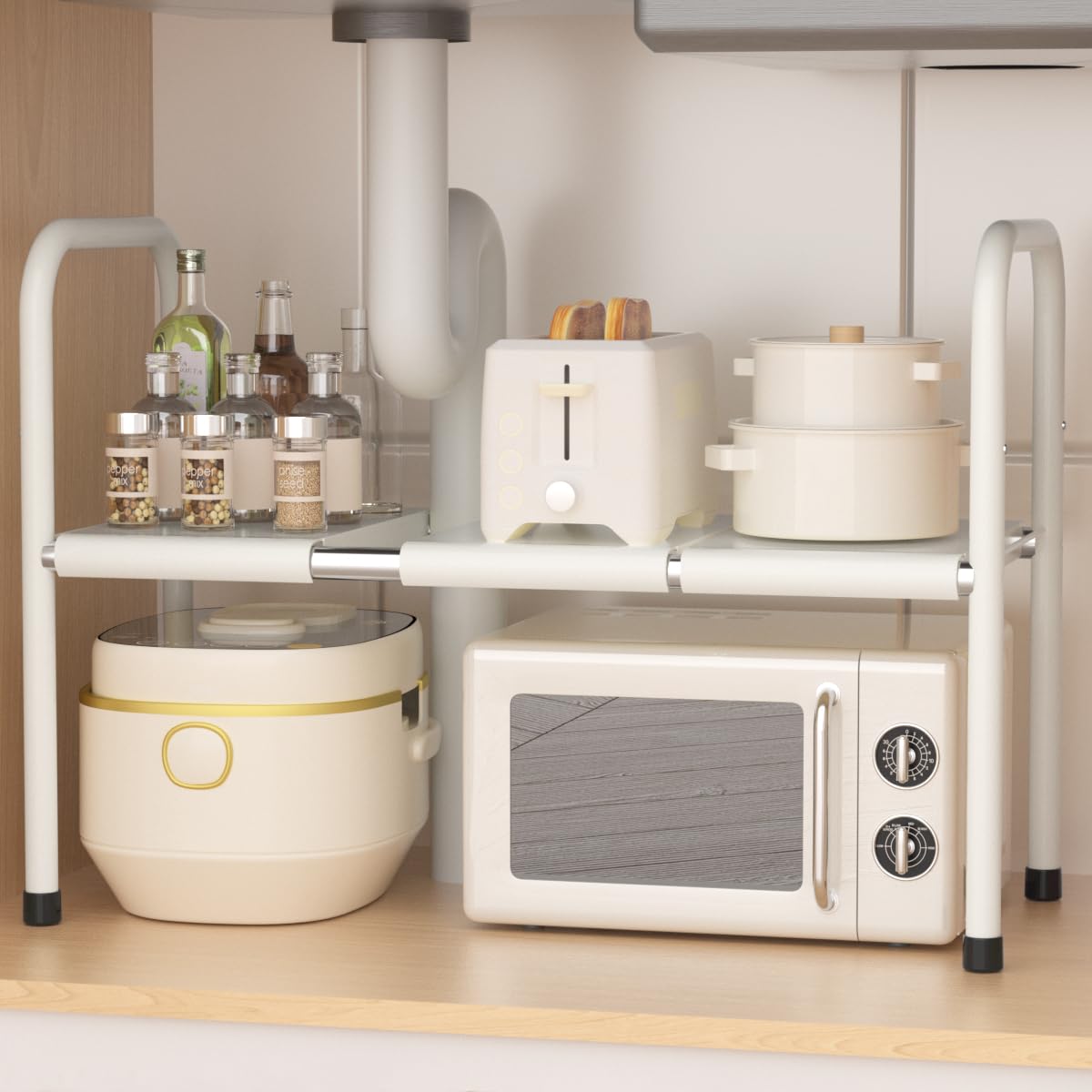 商品名:RiniroLis シンク下 収納ラック キッチン下収納 伸縮 キッチンラック 洗面台下 収納ラック シンク下収納棚 横幅・高さ調整可能 滑り止め 組み立て簡単 日本語取扱説明書付 (ホワイト 棚板3枚 1段)
