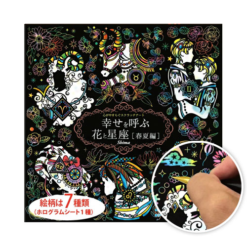 スクラッチアート 幸せを呼ぶ花と星座 春夏編 大人の塗り絵 ホログラム仕様1枚含む計7枚入り スクラッチアートペン付