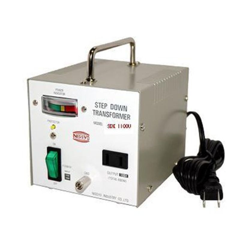 商品の説明 ●安全で便利なデラックスタイプ降圧(電圧ダウン)変圧器●今お使いの電気製品が海外でご使用できます●安全・便利です●切換スイッチで110V、120Vがえらべます●使用中の電気量がわかるインジケータ付●電源スイッチ付●アース端子付(中継)●過電流プロテクタ付(手動復帰式)●アメリカ・カナダ・台湾など入力電圧AC110V/120V地域用(110V/120V切換式)●出力容量:1100W●本体プラグ:A●出力口数:1●寸法:W110×H123×D102mm●重量:3.1Kg より ●ダウン仕様トランスフォーマー。機能充実の安全・便利タイプ ●海外で日本の電気製品をご使用できます ●過電流プロテクタ付き(手動復帰) ●入力電圧と消費容量の確認をしてください