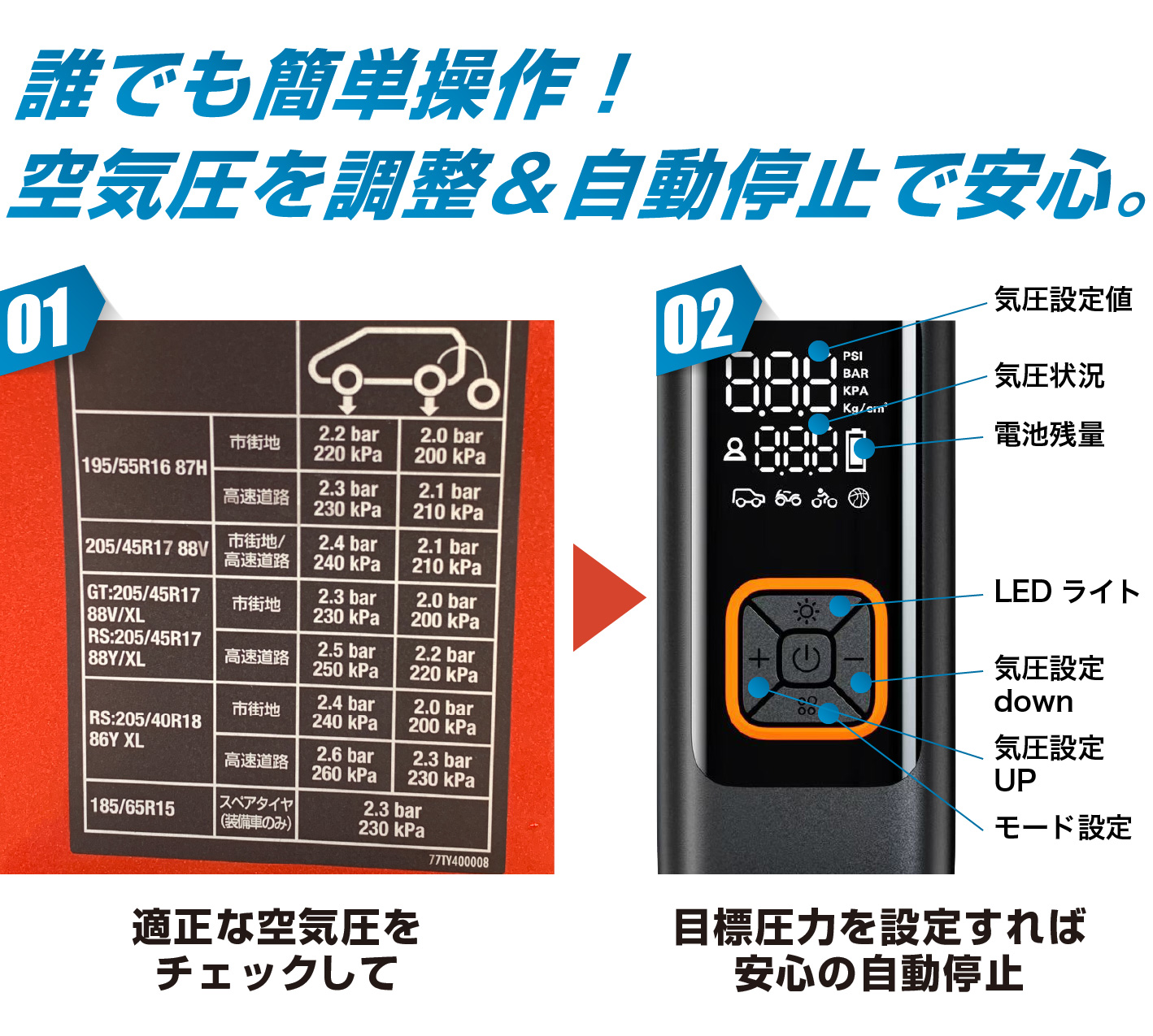 150 PSI (※測定単位切替: PSI、Kpa、Bar、Kg/cm2)