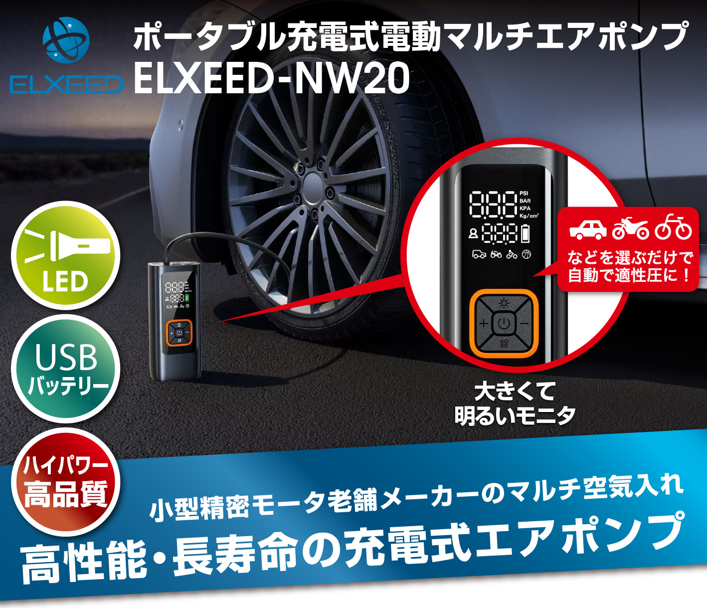 ポータブル充電式電動エアポンプ(スマートハイパーエアーポンプ)、コードレス充電式電動空気入れELXEED-NW20(エルシードNW20)