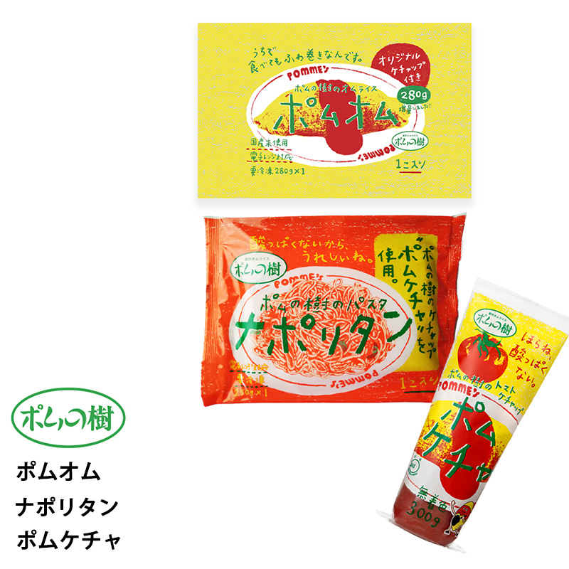 内容量:ポムの樹の ポムオム1袋230g×【4袋】+ナポリタン1袋250g×【4袋】+ポムケチャ300g×【1本】のセット