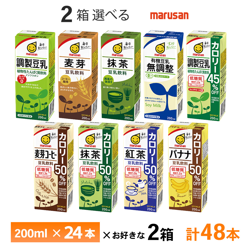 2ケース選べる マルサン 豆乳 200ml×48本 送料無料 常温保存 紙パック 調整豆乳 無調整 有機 麦芽コーヒー 抹茶 紅茶 バナナ カロリーオフ