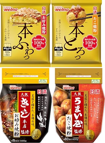 ・日清 国内小麦粉100%使用したふわとろ食感を楽しむ&名店監修を楽しむ お好み焼粉・たこ焼粉食べ比べセット(本ふわっお好み焼粉、本とろったこ焼粉、大阪きじ本店監修お好み焼粉、大阪うまい屋監修たこ焼粉)