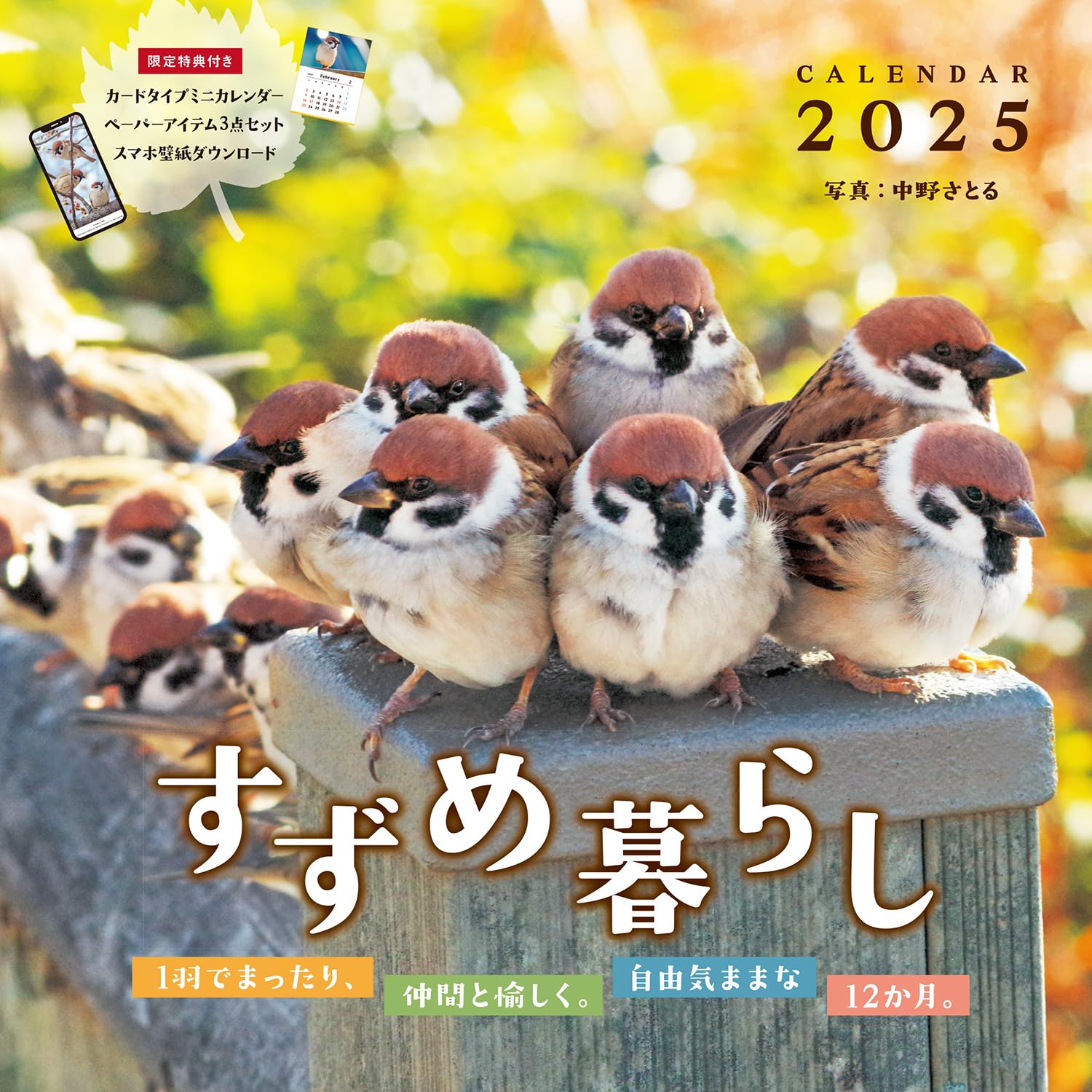 1羽でまったり、仲間と愉しく、自由気ままなすずめの12ヶ月。 可愛いすずめたちの暮らしをながめていると、ほんわか心癒もされます。 意外と豊かな表情やしぐさ、仲間同士のやりとりなど、ながめていて飽きることはありません。 21×21cmの小さめのましかくサイズの壁掛けなので、 リビングのほかトイレやキッチンなど飾る場所を選ばず使いやすい商品です。 限定特典として、ファンにはたまらない切り取って使えるカードタイプのカレンダー、 一筆箋&ミニカード&しおりの豪華ペーパーアイテム付き。 カレンダー本編とは違う写真でミニ写真集のような見応えです。【ここがポイント!】 ●壁掛け/月めくり ●季節のイベント、六曜、二十四節気、雑節、朔望、前後月を掲載 ●サイズ: A4変形判(展開時420mm × 210mm) ●美しい高画質印刷 ●6週月の月末も予定が書き込める6週表示デザイン ●「ペーパーアイテム&ミニカレンダー」の実物付録付き
