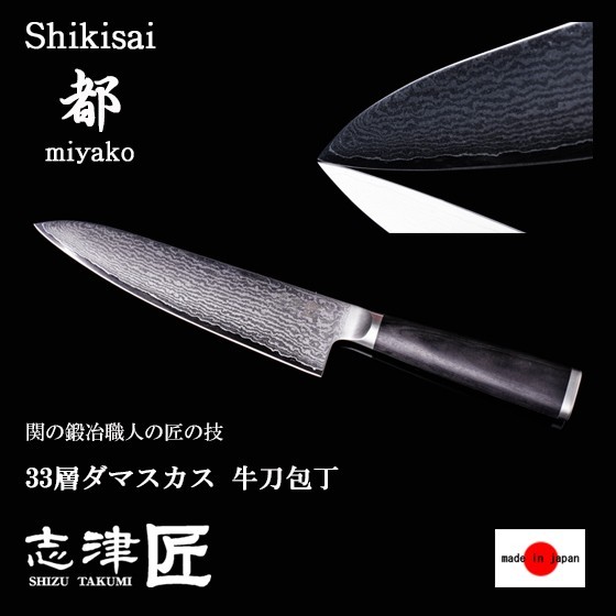送料無料 アウトドア BBQ キャンプ 志津刃物製作所 包丁 家庭用 牛刀包丁 キッチンナイフ 洋 和 関 日本製 180mm 33層ダマスカス 肉 野菜用 made in japan 職人技 匠 手作り ハンドメイド 男 旦那 彼氏 誕生日 父の日 クリスマス プレゼント