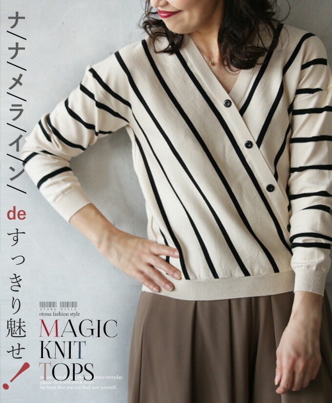 ◆◆トップス カットソー レディース オフホワイト Vネック 長袖 ニット おしゃれ カジュアル ナナメラインですっきり魅せ OTONA 40代 50代 60代