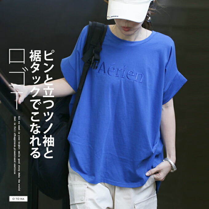 トップス Tシャツ レディース ブルー 半袖 ドロップショルダー ロゴ カジュアル エレガント ピンと立つツノ袖と裾タックでこなれるロゴT OTONA 40代 50代 60代