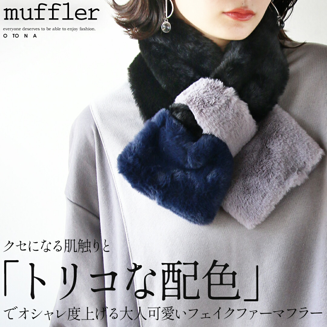 マフラー レディース ブラック ブルー クセになる肌触りと トリコな配色 でオシャレ度上げる 大人可愛い フェイクファー マフラー OTONA 40代 50代 60代