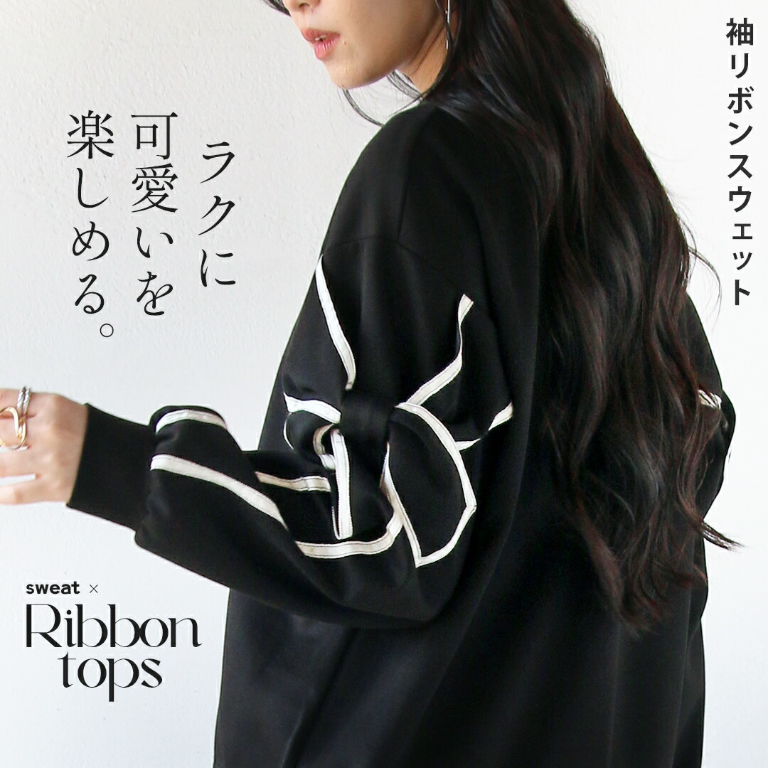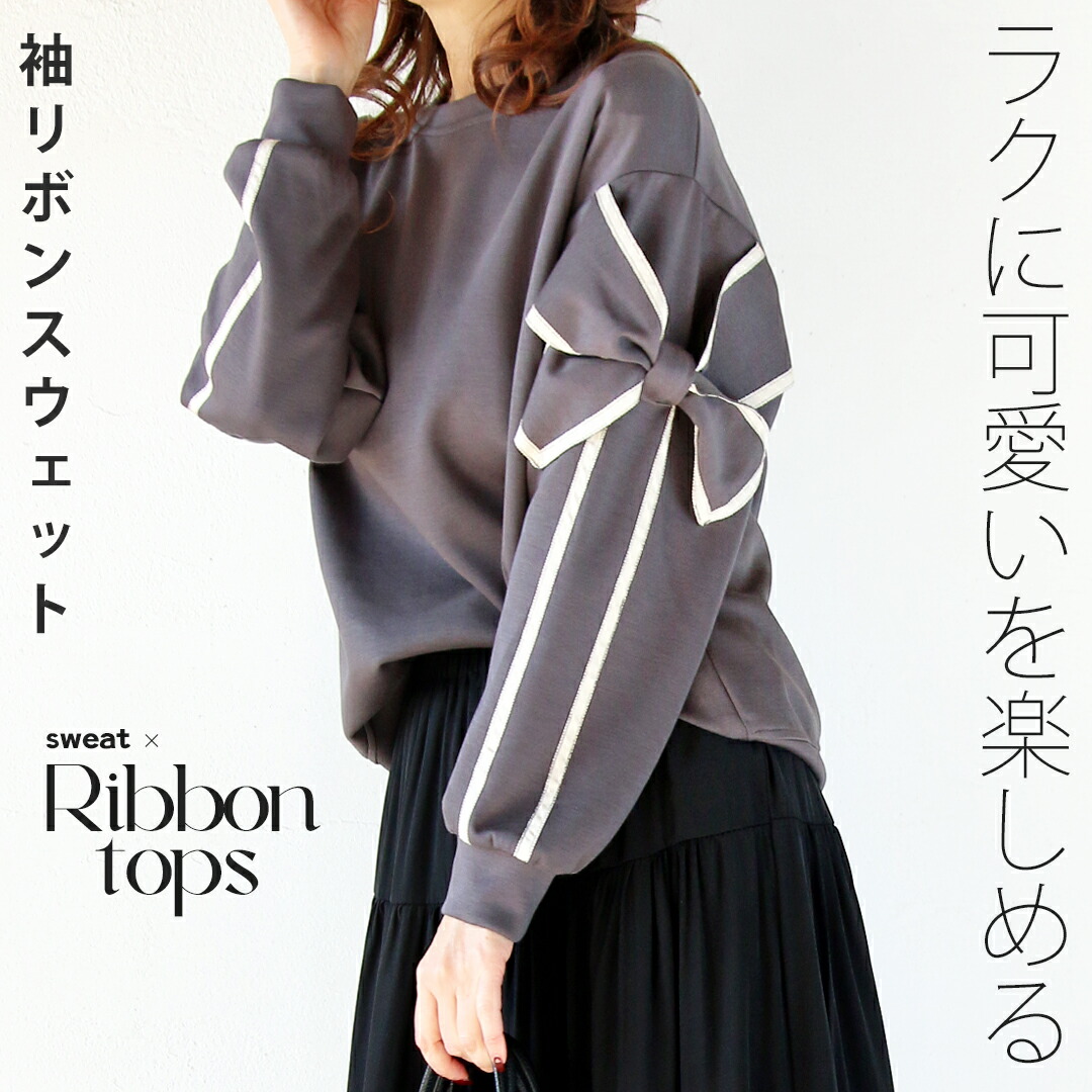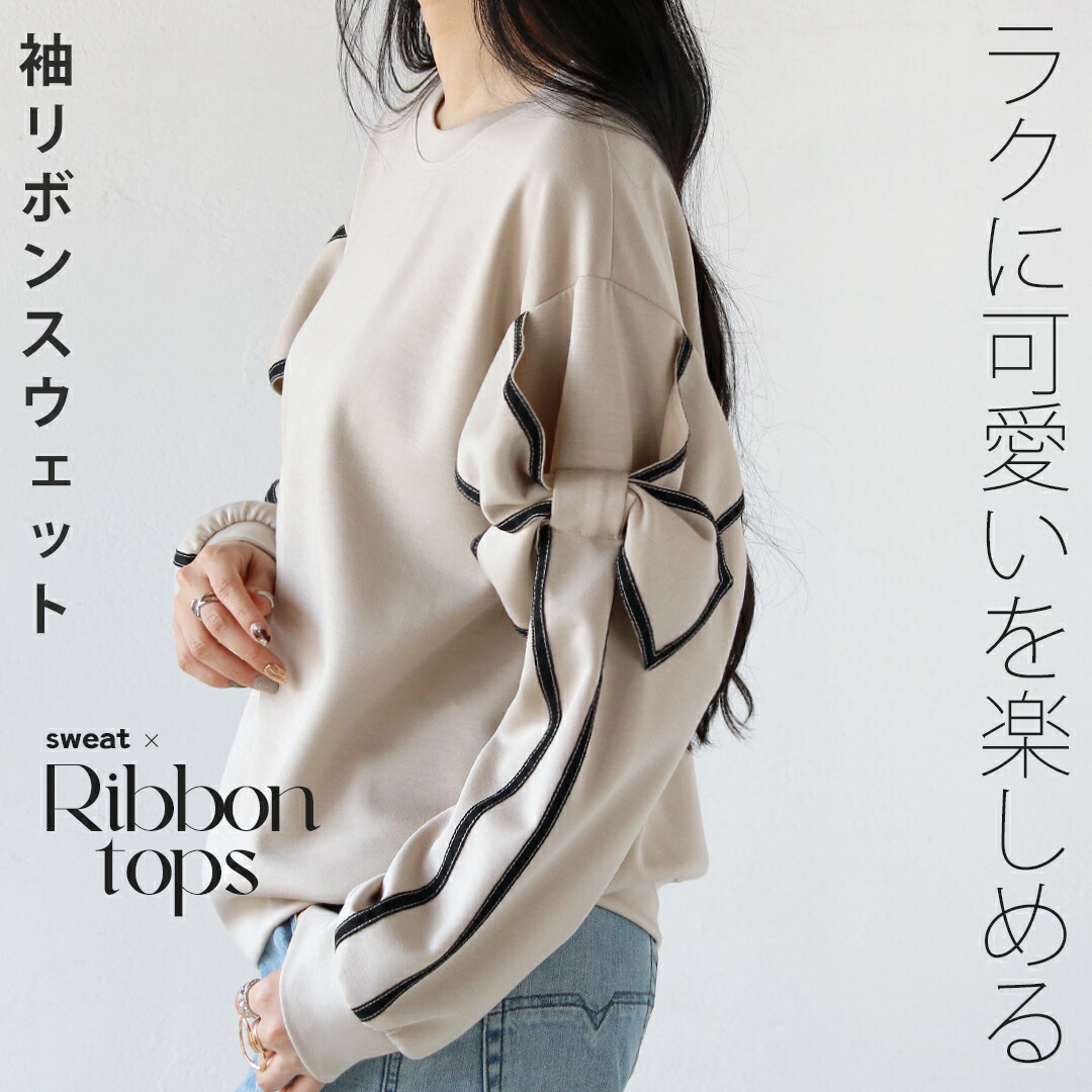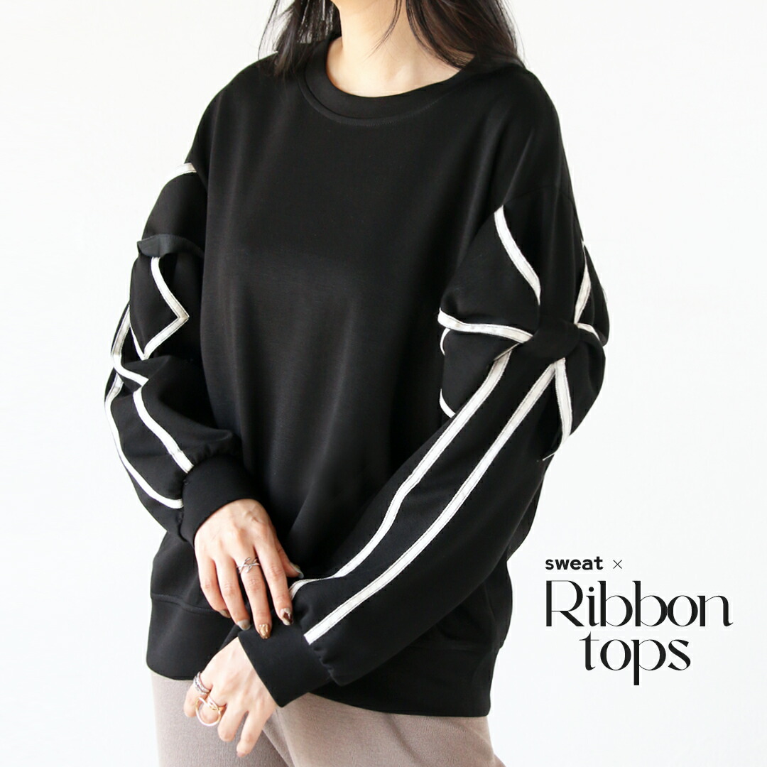 トップス リボン スウェット カットソー ラク可愛いを楽しめる袖リボンスウェット ブラック グレー ベージュ 長袖 春 秋 冬 秋冬 クルーネック ゆったり オーバーサイズ リラックス 落ち感 ドロップショルダー 華奢見せ