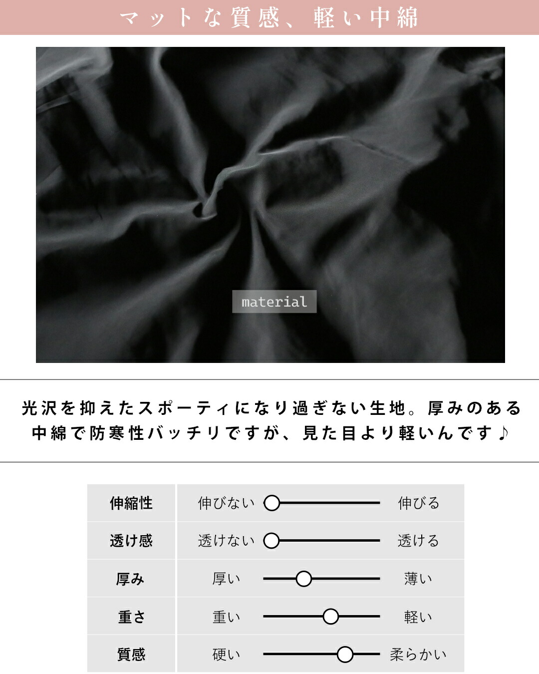 軽くて暖かい、中綿素材を採用。上品なマット質感で、シャカシャカしすぎずスポーティーになりすぎない大人の印象。袖口はマジックテープで風の侵入を防げ、冬の外出にも心強い防寒力です。